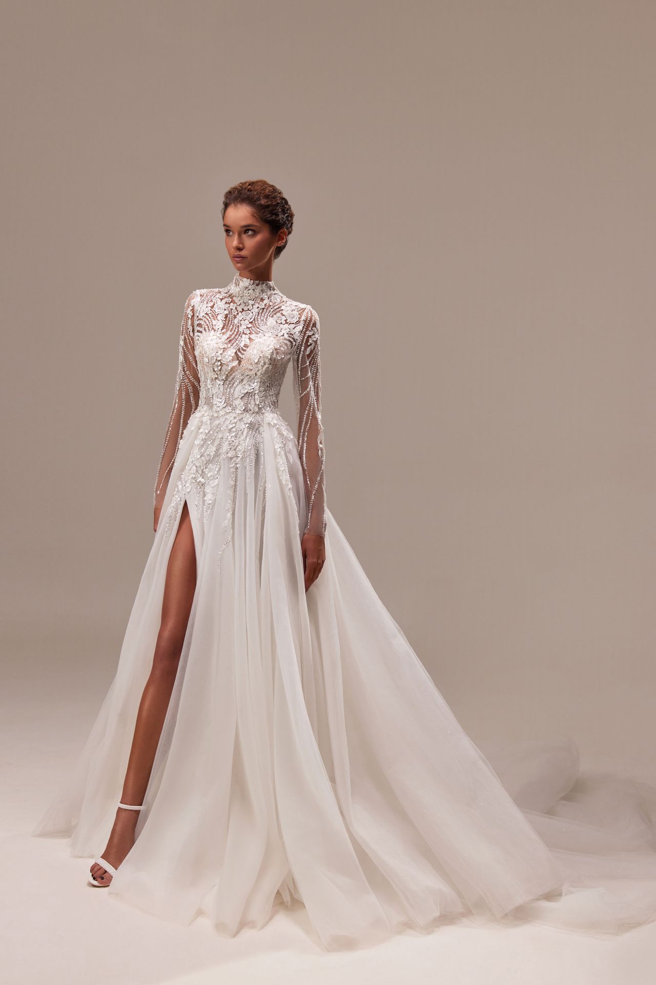 Efektowna suknia z długimi rękawami i zdobionym, półprzezroczystym gorsetem. Ozdobiony koronką i cekinami gorset z długimi rękawami, zapinany z tyłu na guziki i tiulowa spódnica księżniczki z długim trenem i odważnym rozcięciem.