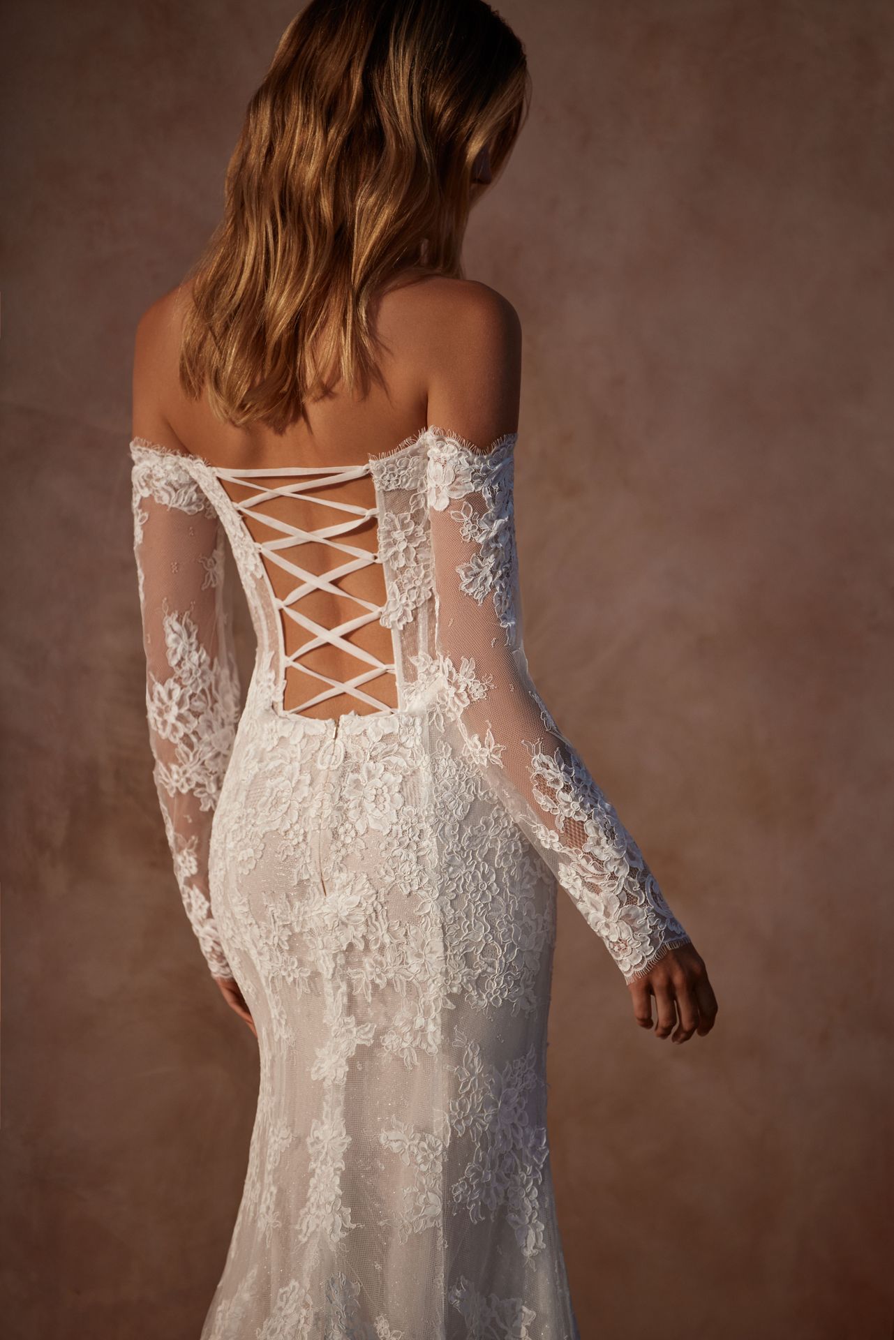 Olśniewająca półprzezroczysta dopasowana suknia ozdobiona cekinowym ornamentem. Posiada gorset w kształcie serca z głębokim dekoltem, odpinane tiulowe rękawy z odkrytymi ramionami, zapięcie na suwak z tyłu i krótki tren.