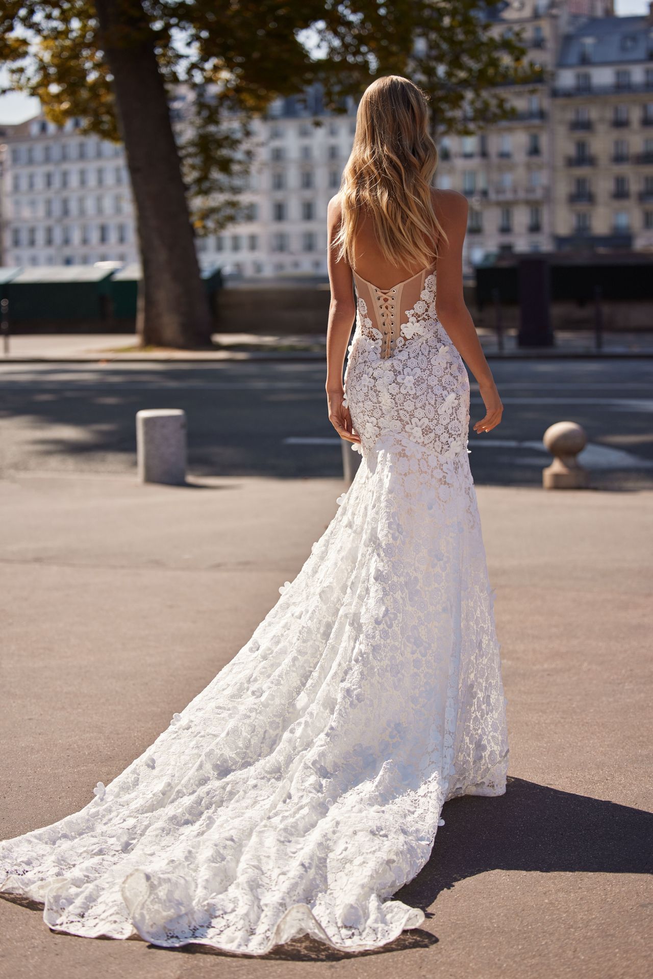 Romantyczna suknia ślubna o kroju syrenki, w całości pokryta kwiecistą koronką. Z dekoltem w kształcie serca, odkrytymi plecami z koronkowym zapięciem i delikatnym krótkim trenem.