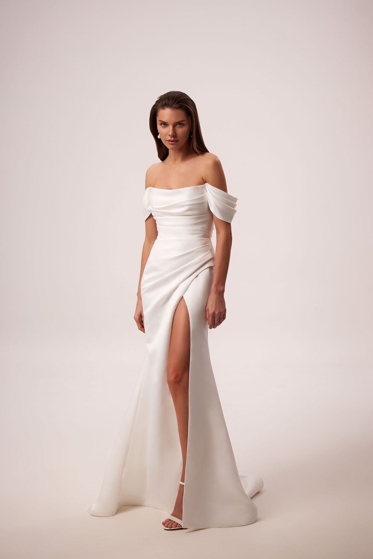 Szykowna suknia ślubna o kroju syrenki uszyta z luksusowego mikado. Posiada prosty, drapowany dekolt z odkrytymi ramionami, zapięcie na suwak z tyłu i dopasowaną spódnicę z rozcięciem z boku i trenem midi.