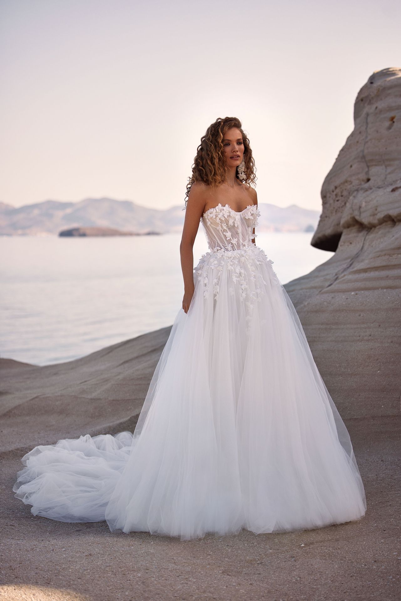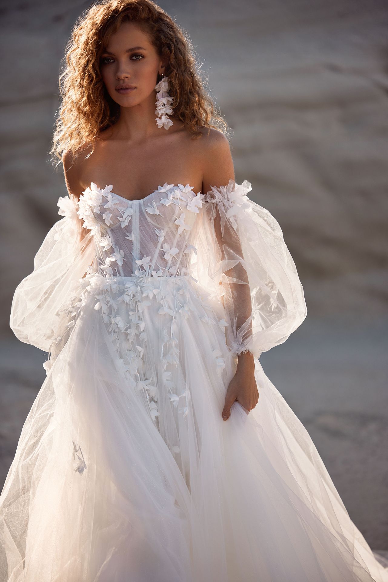 Wspaniała tiulowa suknia ślubna o linii A pokryta brokatem i trójwymiarowymi kwiatami. Gorset w kształcie serca, sznurowanie na plecach, tiulowa spódnica maxi z długim trenem i odpinane bufiaste rękawy ozdobione kwiatami 3D.