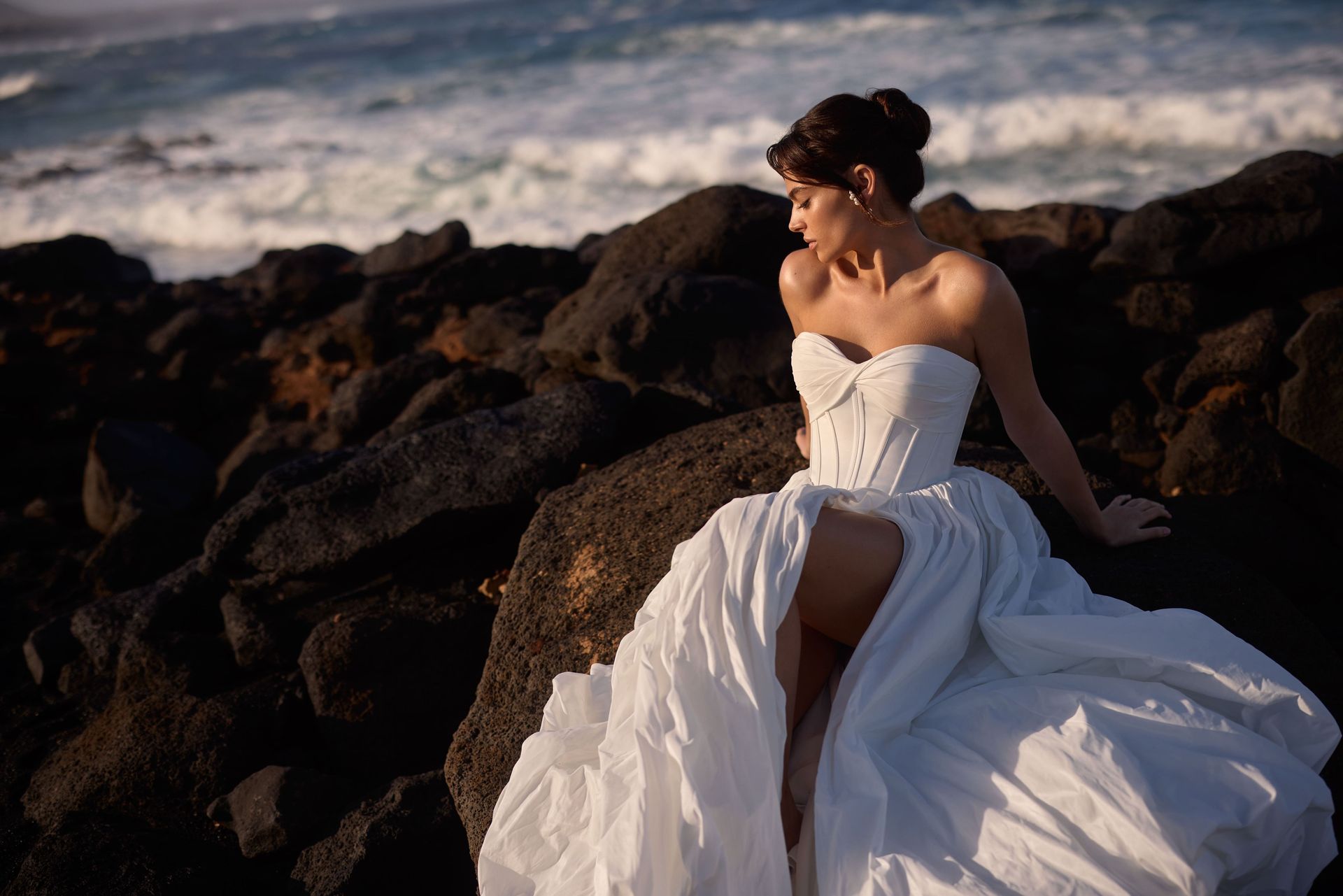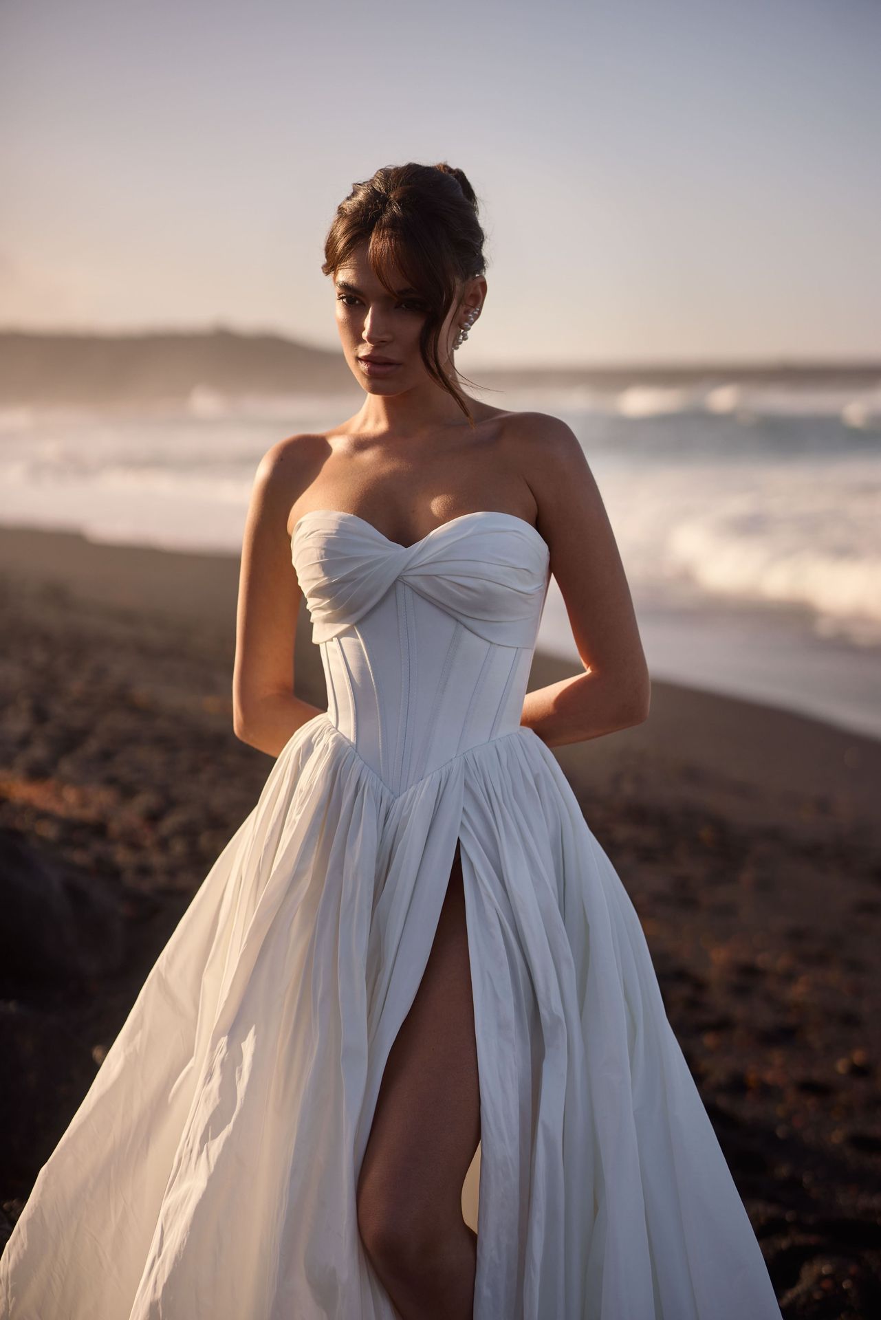 Wyrafinowana suknia ślubna bez ramiączek o linii A z wyrzeźbionym gorsetem z dekoltem w kształcie serca, podkreślonym miękkim drapowaniem i pionowym wiązaniem dla bezszwowego dopasowania. Suknia ma odpinane rękawy odsłaniające ramiona. Obszerna spódnica z gracją opływa talię, z delikatnymi plisami i rozłożystym trenem. Stylizację można urozmaicić szalem Danessa.