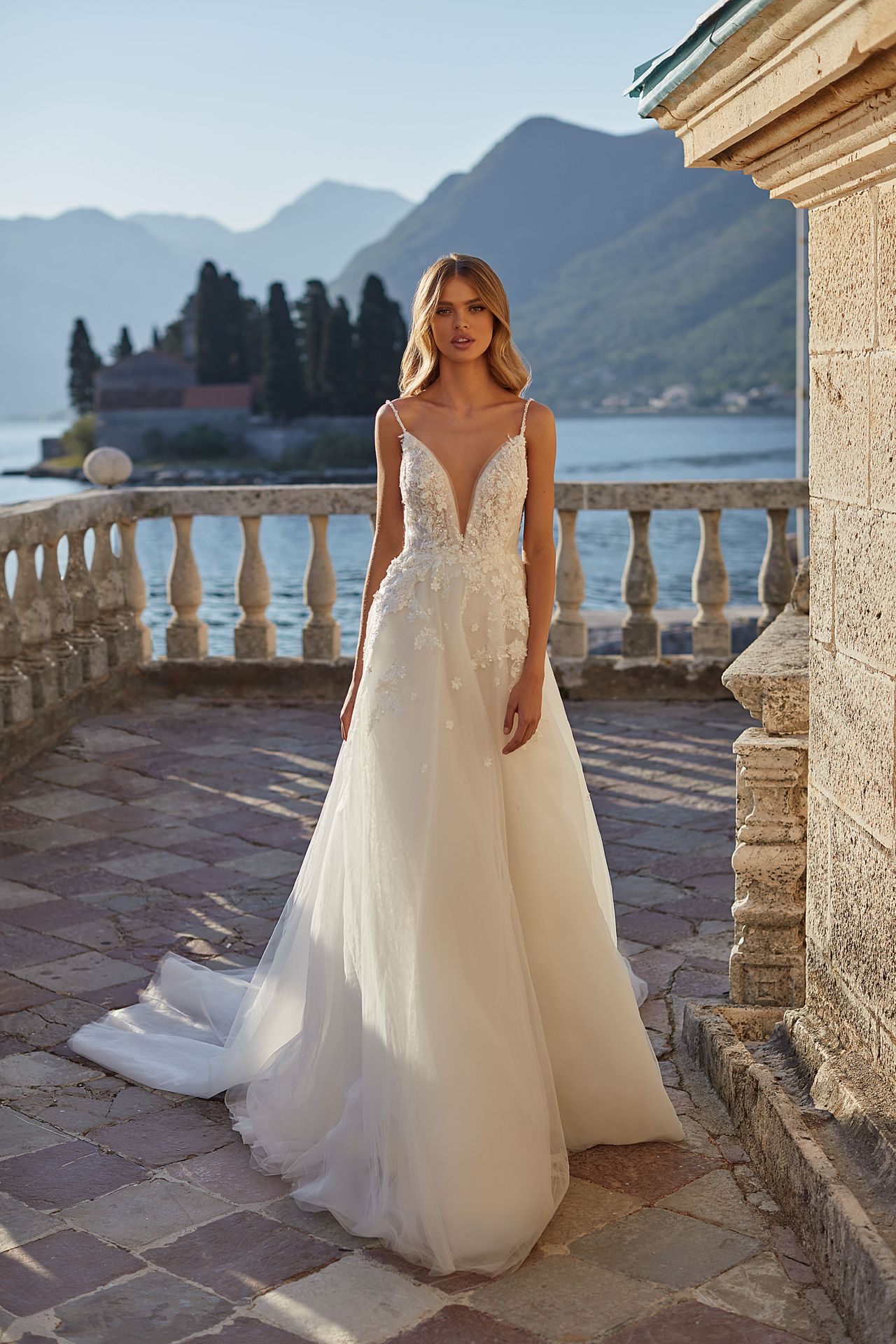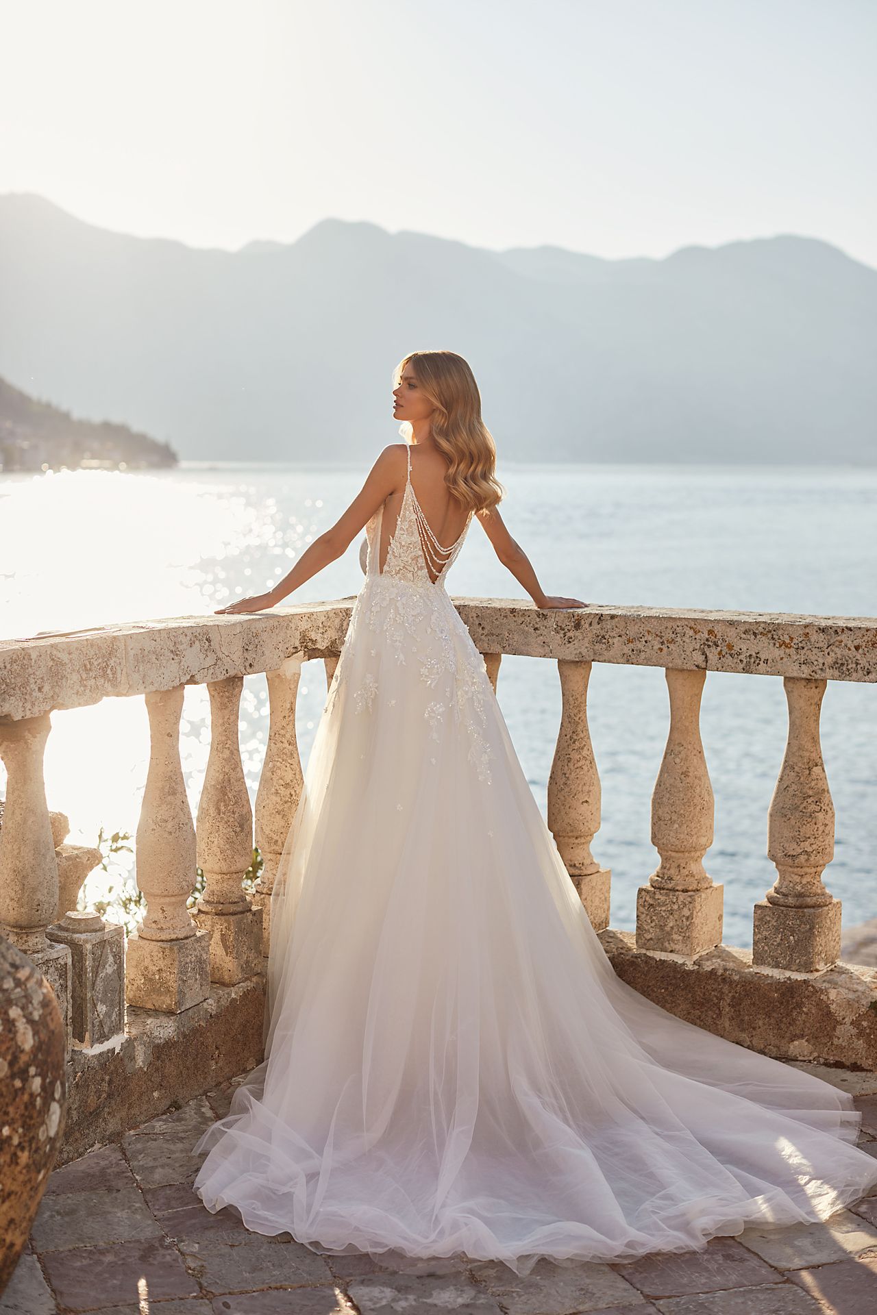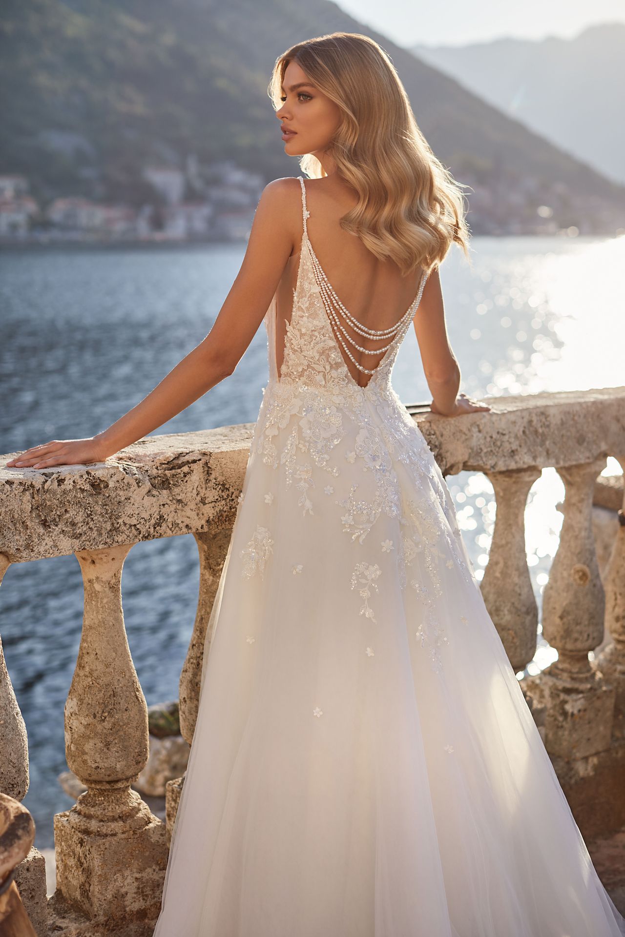 Suknia na ramiączkach w kolorze kości słoniowej z głębokim dekoltem w kształcie litery V i odkrytymi plecami z perłowym sznurkiem. Suknia jest skromnie ozdobiona kwiatową koronką.