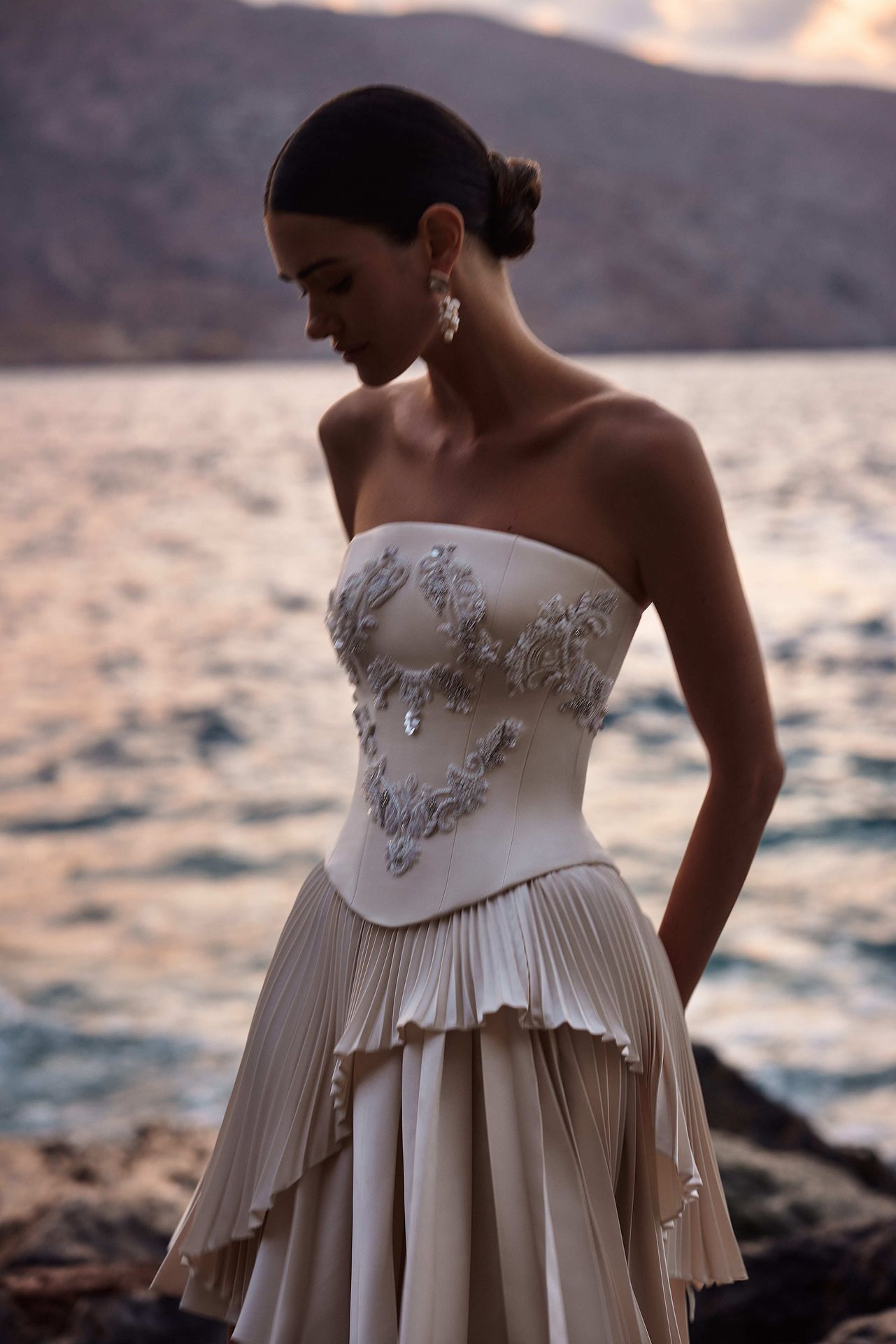 Inspirowany stylem vintage gorset wykonany z luksusowej satyny i ozdobiony misternymi koralikami i połyskującymi cekinami, tworzącymi ornament inspirowany barokiem. W komplecie odpinane ramiączka ozdobione perłowymi detalami. Strukturalna konstrukcja ze sznurowanym zapięciem z tyłu podkreśla wyrzeźbioną sylwetkę i zapewnia idealne, indywidualne dopasowanie. Elegancka spódnica o kroju syrenki wykonana z luksusowej satyny. Dopasowany krój z gracją modeluje sylwetkę i pięknie rozkloszowuje się u dołu. Gorset można połączyć z plisowaną mini spódniczką Gisella, aby uzyskać nowoczesny ślubny wygląd. Gotowa do tańca asymetryczna spódnica z delikatnym plisowaniem i warstwowym wzorem. Wykonana z lejącej satyny w bogatym odcieniu cappuccino, układa się bez wysiłku, tworząc miękki ruch.