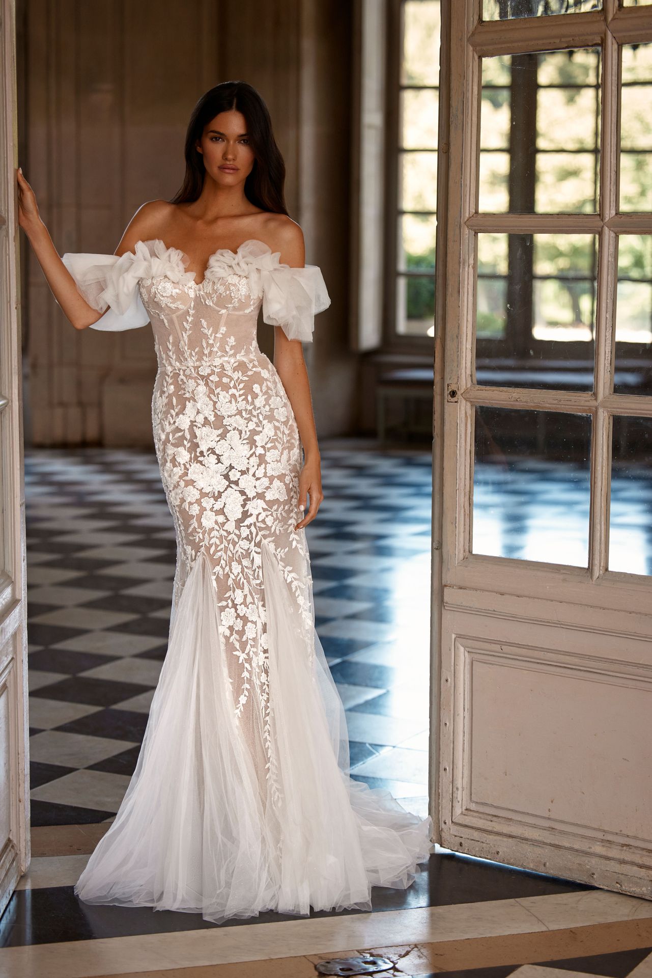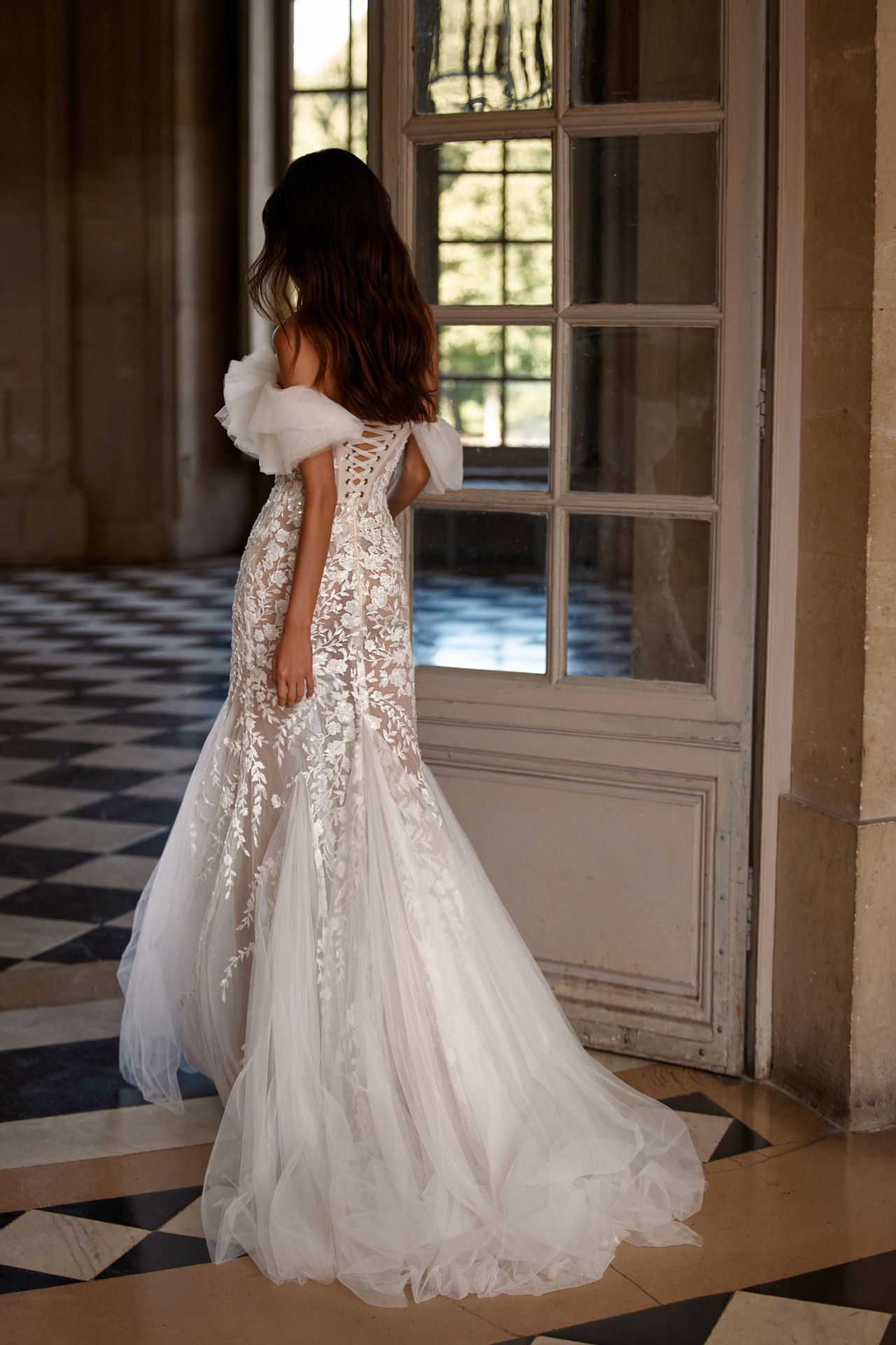Bujna półprzezroczysta błyszcząca suknia ślubna z marszczonymi rękawami na ramionach, cekinową aplikacją z kwiatowej koronki, cielistą podszewką, sznurowanym zapięciem na plecach i krótkim bufiastym trenem.