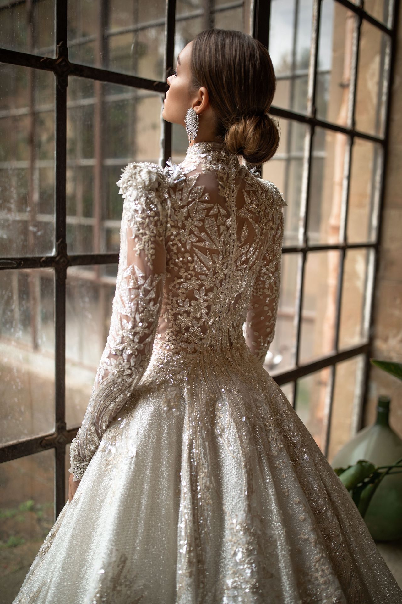 Ozdobiona kryształkami królewska suknia balowa z długim rękawem, półprzezroczystym gorsetem z golfem, w pełni cekinową spódnicą i niezwykle długim trenem.