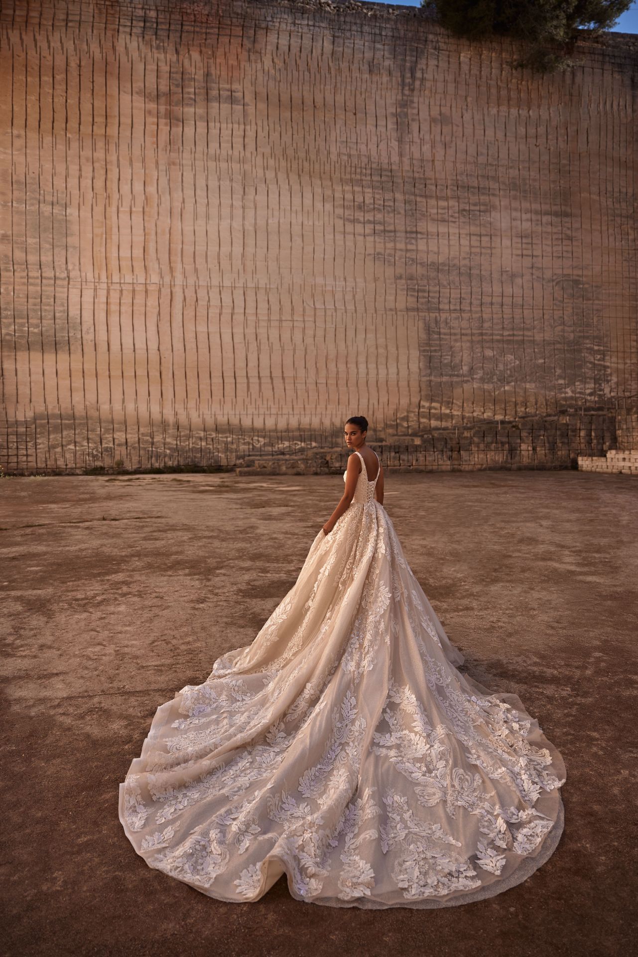 Wspaniała suknia ślubna księżniczki z błyszczącej koronki misternie ręcznie zdobionej kwiatowymi ornamentami koronkowymi i cekinami. Posiada gorset z dekoltem w kształcie serca, koronkowe zapięcie i szerokie ramiączka zapewniające idealne dopasowanie. Suknia jest wzbogacona o obszerną, błyszczącą spódnicę ozdobioną koronkowymi motywami kwiatowymi i ma bogaty długi tren. Dopełnieniem całości może być pasujący pompatyczny welon katedralny Idalia.
