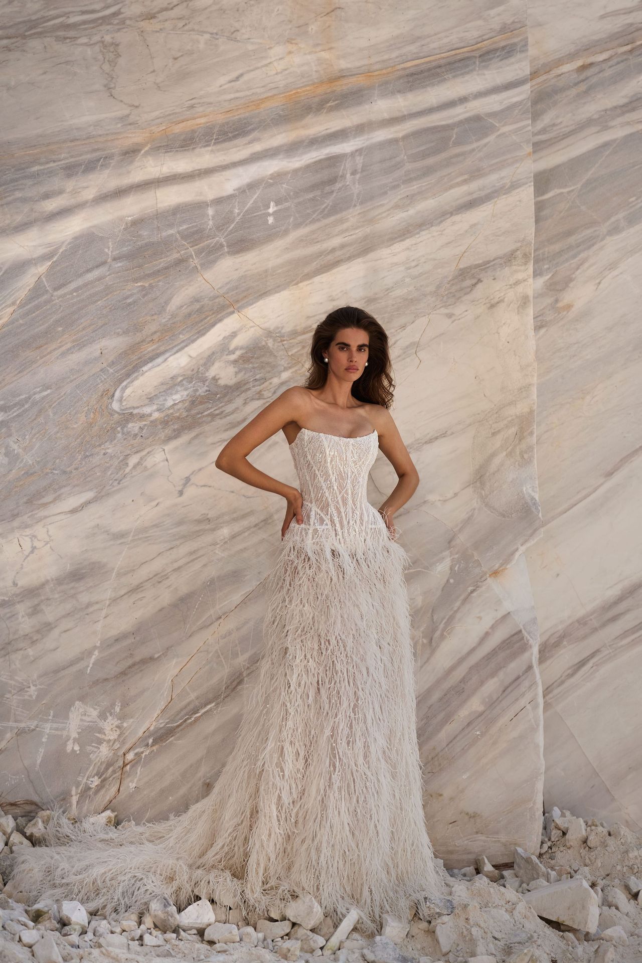 Wyrafinowana suknia ślubna 2 w 1, dopasowana i ręcznie zdobiona haftem z koralików oraz strusimi piórami. Bezrękawowy gorset mieni się pełnym haftem, a odpinana długa spódnica z piórami pozwala zmienić lekki, mini fason w spektakularną kreację ślubną. W zestawie znajduje się cielista mini halka oraz dopasowane figi dla komfortu i subtelnego krycia pod dekoracyjnymi warstwami.