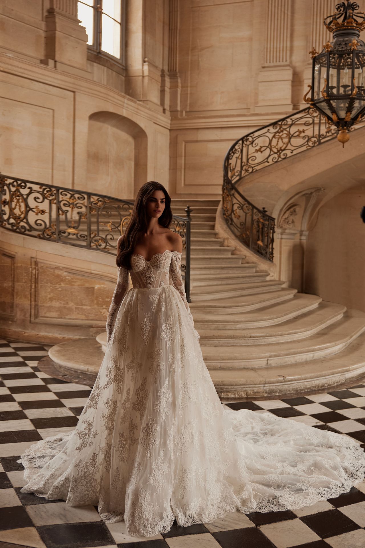 Elegancka suknia ślubna o linii A z długimi rękawami i odkrytymi ramionami, wykonana z koronki chantilly. Z dekoltem w kształcie serca, gorsetem bez ramiączek z długimi rękawami, zamkiem błyskawicznym na plecach i spódnicą maxi princess z trenem maxi. Całość podkreśla satynowy gorset ozdobiony ręcznie koronkową aplikacją i sznurowanym zapięciem z tyłu.