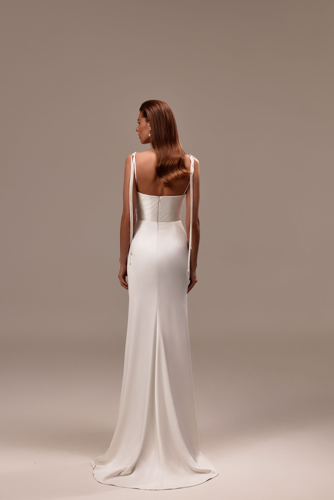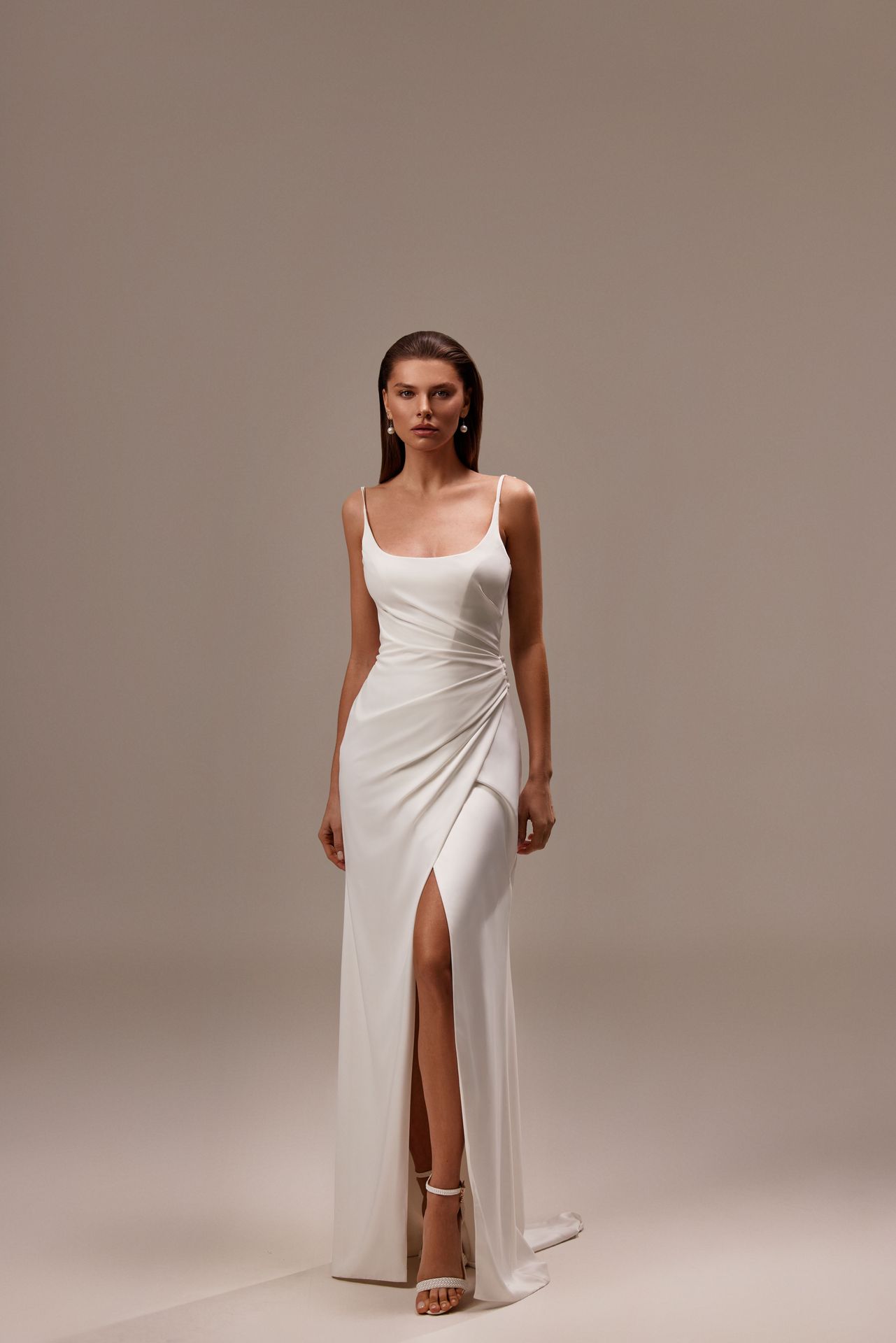 Elegancka suknia o kroju syrenki na ramiączkach typu spaghetti wykonana z elastycznej satyny. Prosty dekolt, ozdobione kryształkami ramiączka typu spaghetti zwisające z tyłu, zamek błyskawiczny z tyłu i odważne rozcięcie na wysokości uda, podkreślone asymetrycznym drapowaniem.