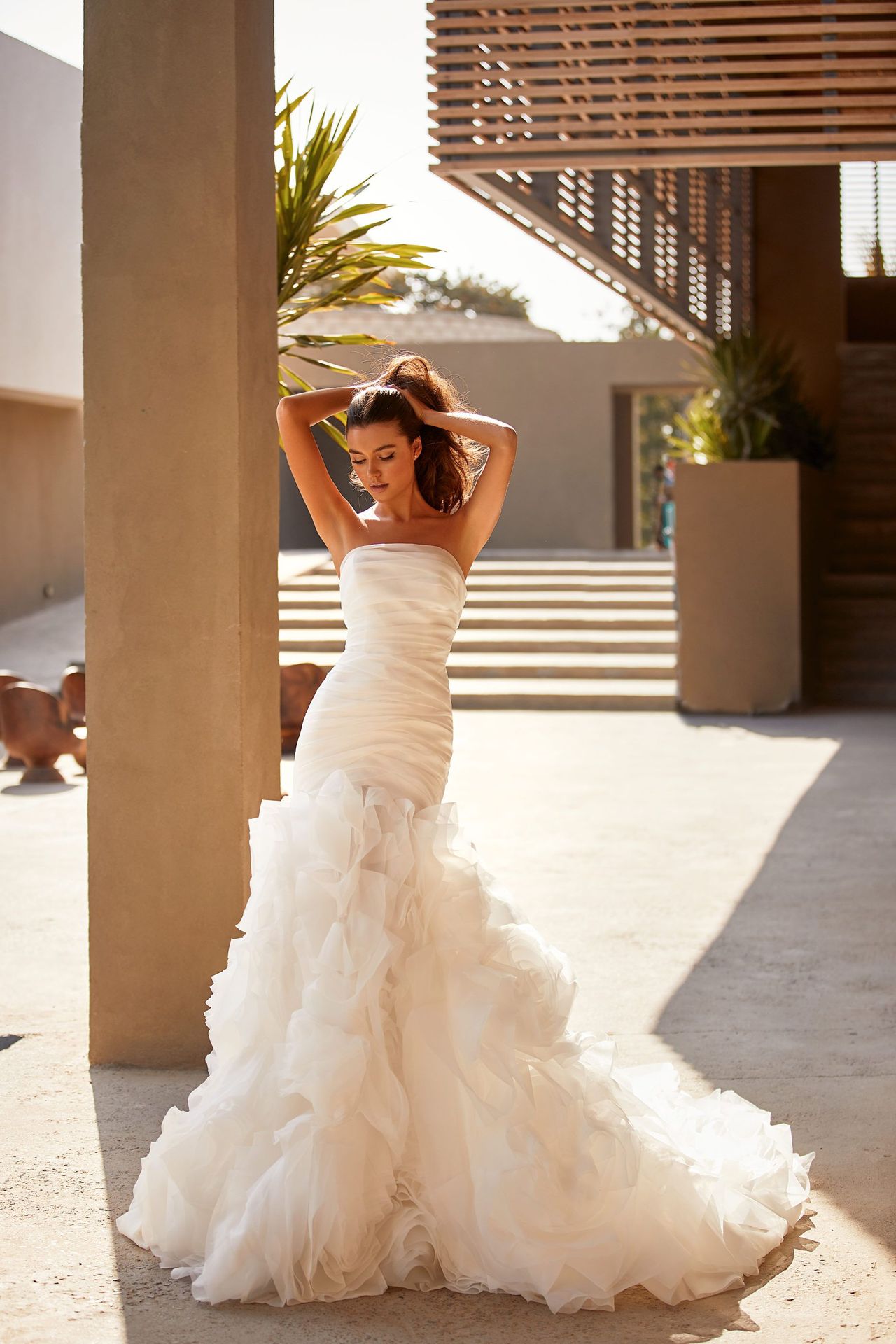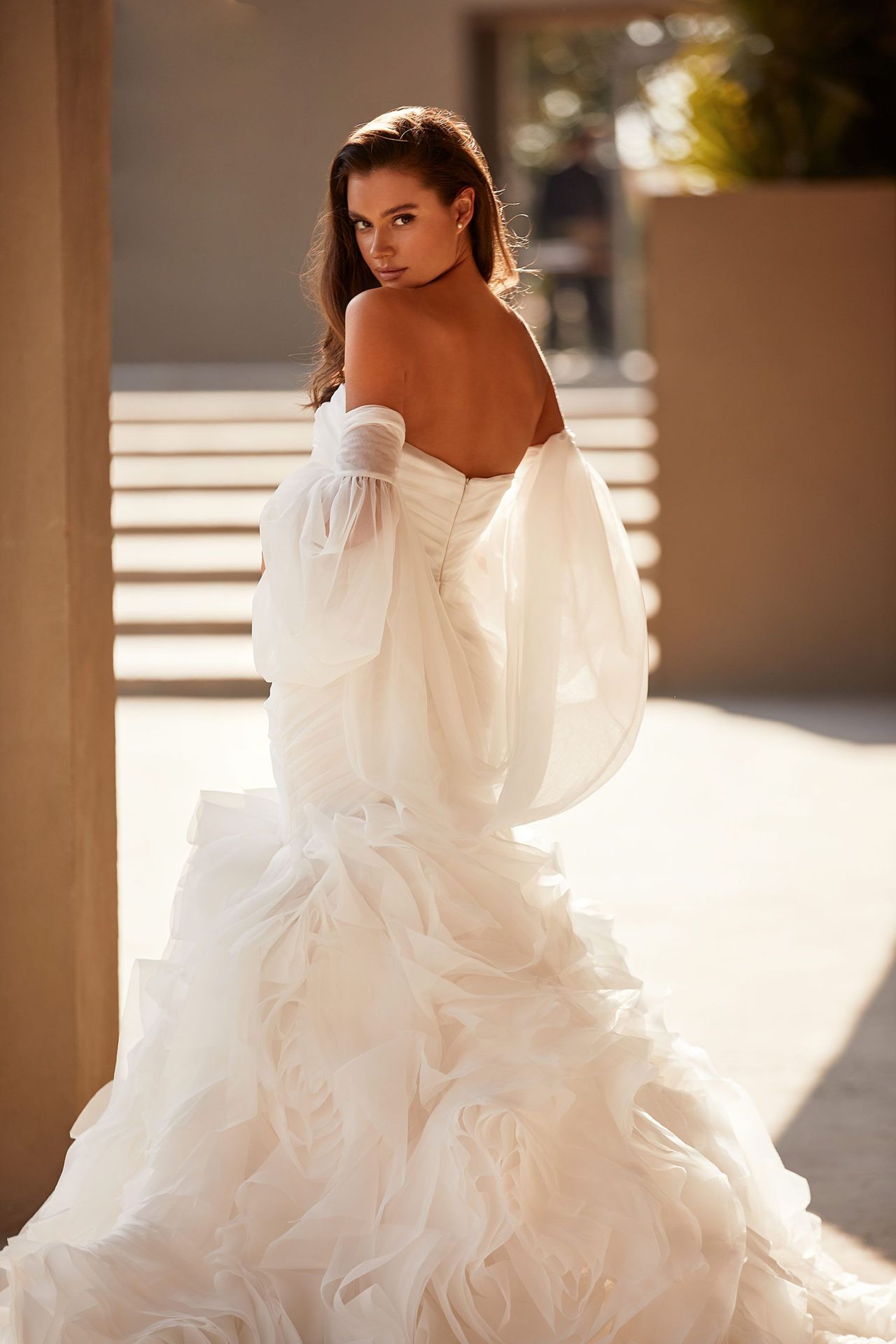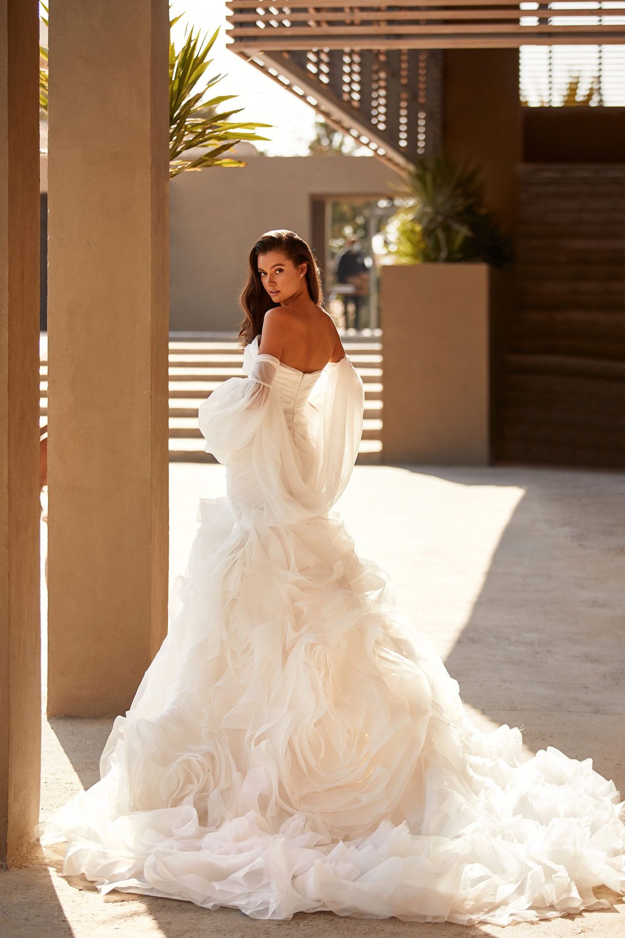 Kobieca suknia ślubna bez ramiączek w kolorze białym. Posiada marszczoną tiulową sylwetkę syrenki, bufiaste kaskadowe falbany i długi tren. Dopełnieniem są odpinane przezroczyste długie rękawy z odkrytymi ramionami.