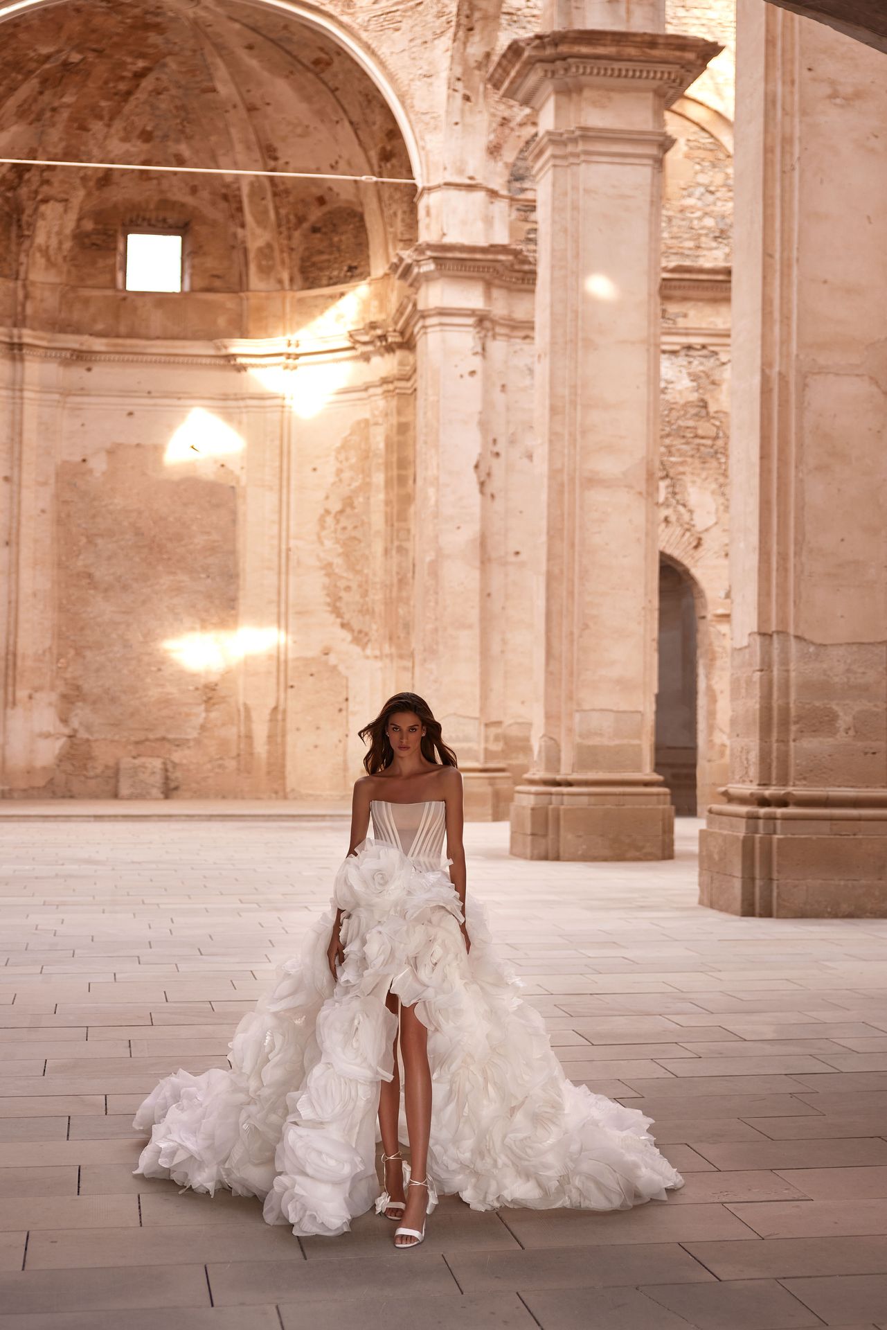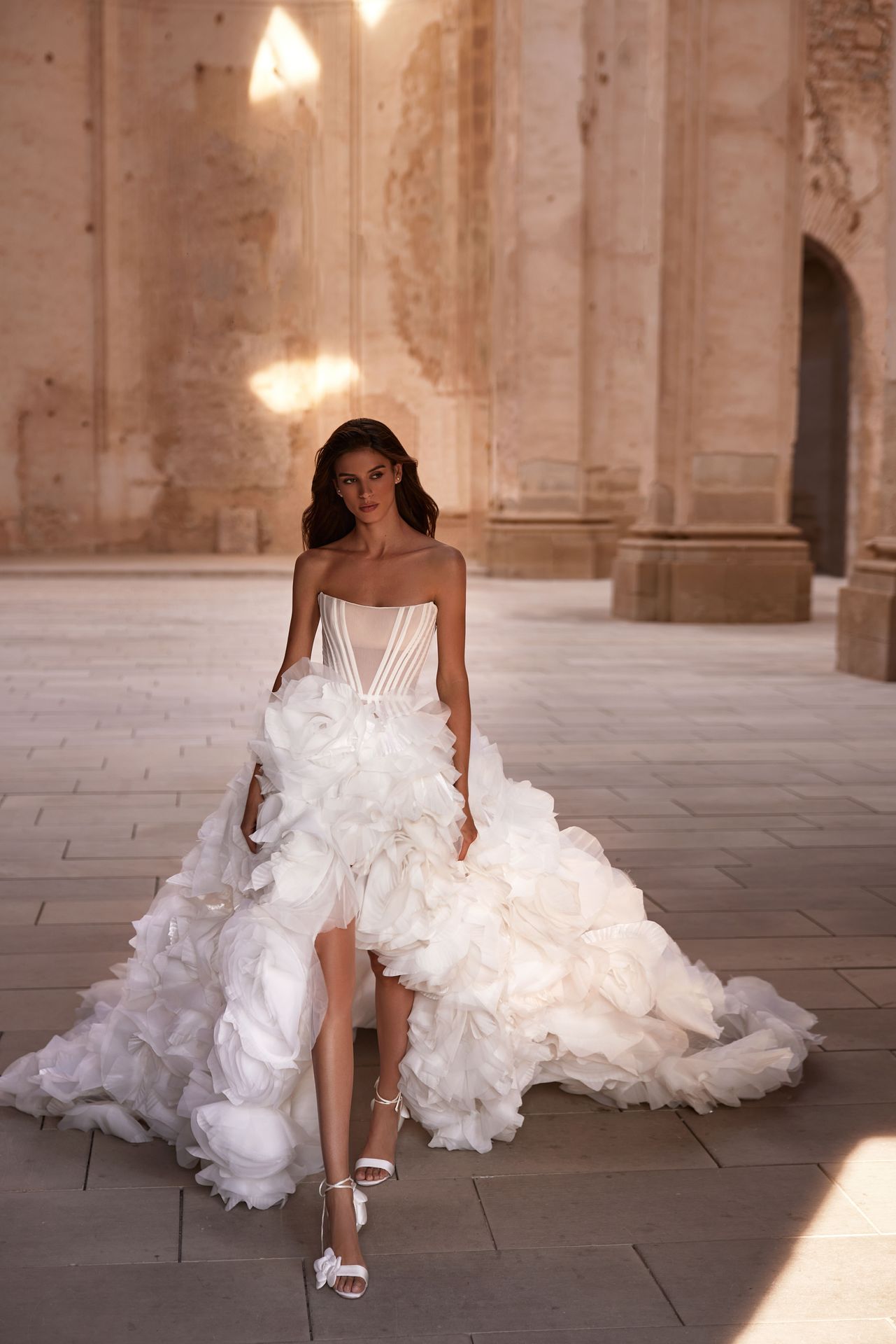 Zjawiskowa suknia ślubna z półprzezroczystym gorsetem na suwak i bogatą, obszerną spódnicą maxi z długim trenem, rozcięciem z przodu i dziesiątkami warstw organzy ręcznie wykonanych w kwiaty.