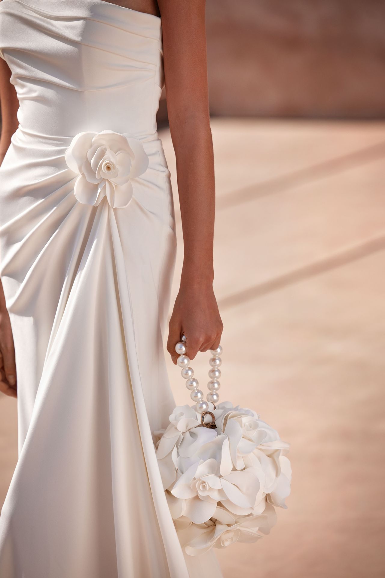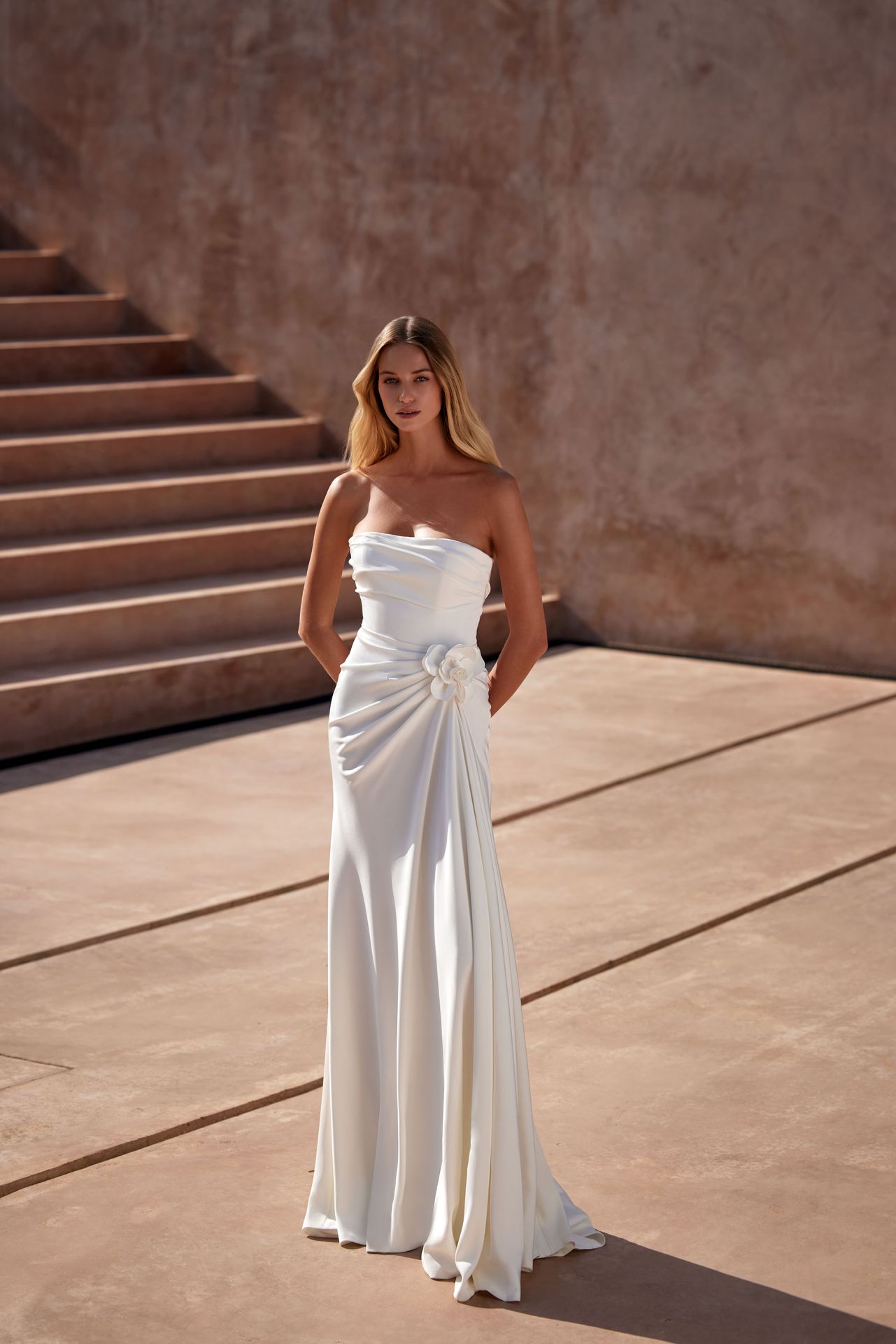 Mniej znaczy więcej - suknia bez rękawów uszyta z satyny. Ma prosty dekolt, dopasowaną sylwetkę z kwiatową aplikacją w talii, która podkreśla tren o długości do podłogi i zapięcie na suwak z tyłu.