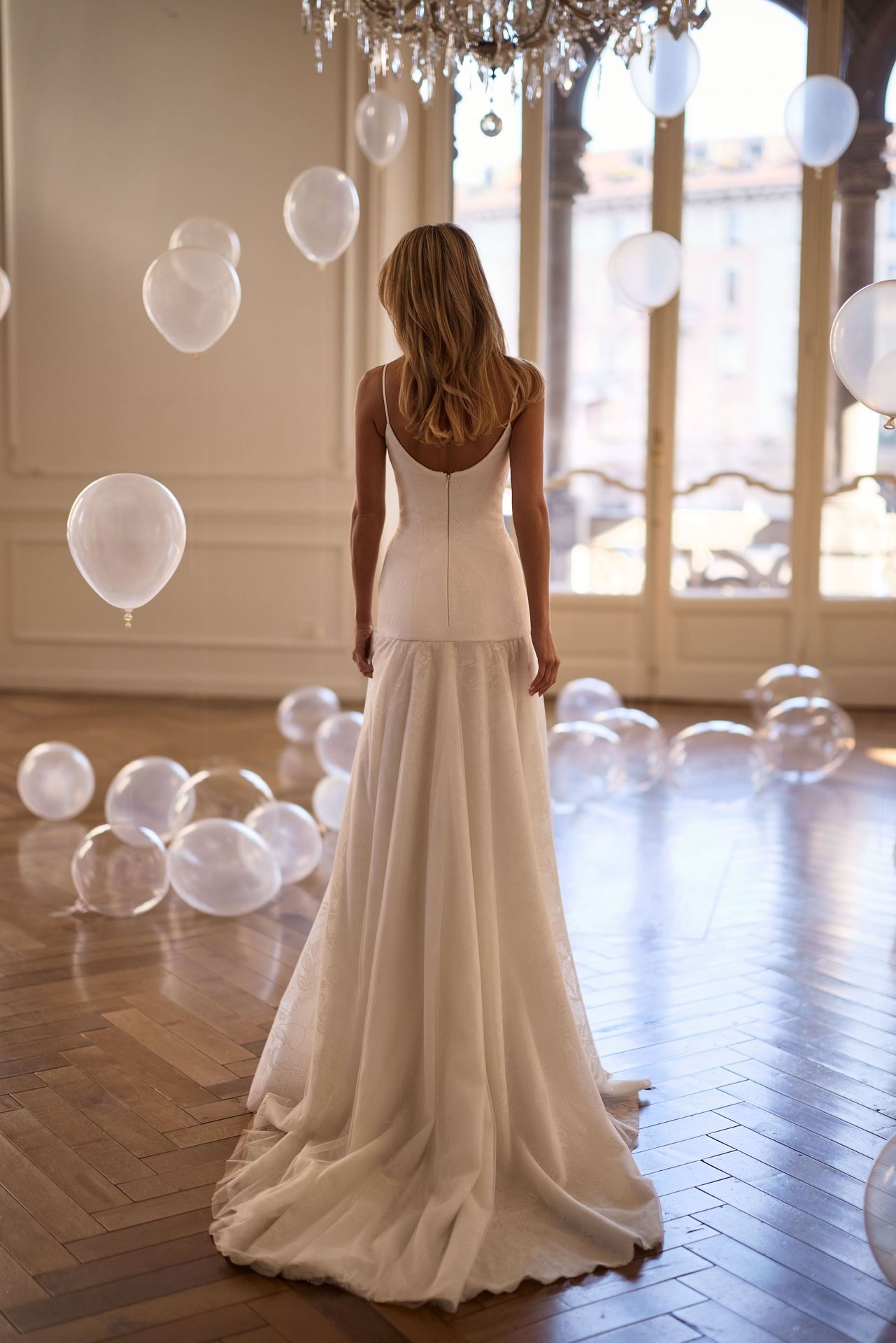 Urocza suknia ślubna o kroju fit-and-flare z delikatnej koronki chantilly z prześwitującą koronkową nakładką. Zaprojektowana z eleganckim dekoltem w kształcie litery U na ramiączkach typu spaghetti i otwartymi plecami w kształcie litery U, zabezpieczonymi ukrytym suwakiem błyskawicznym. Strukturalny gorset elegancko przechodzi w lejącą spódnicę z miękkim, długim trenem.