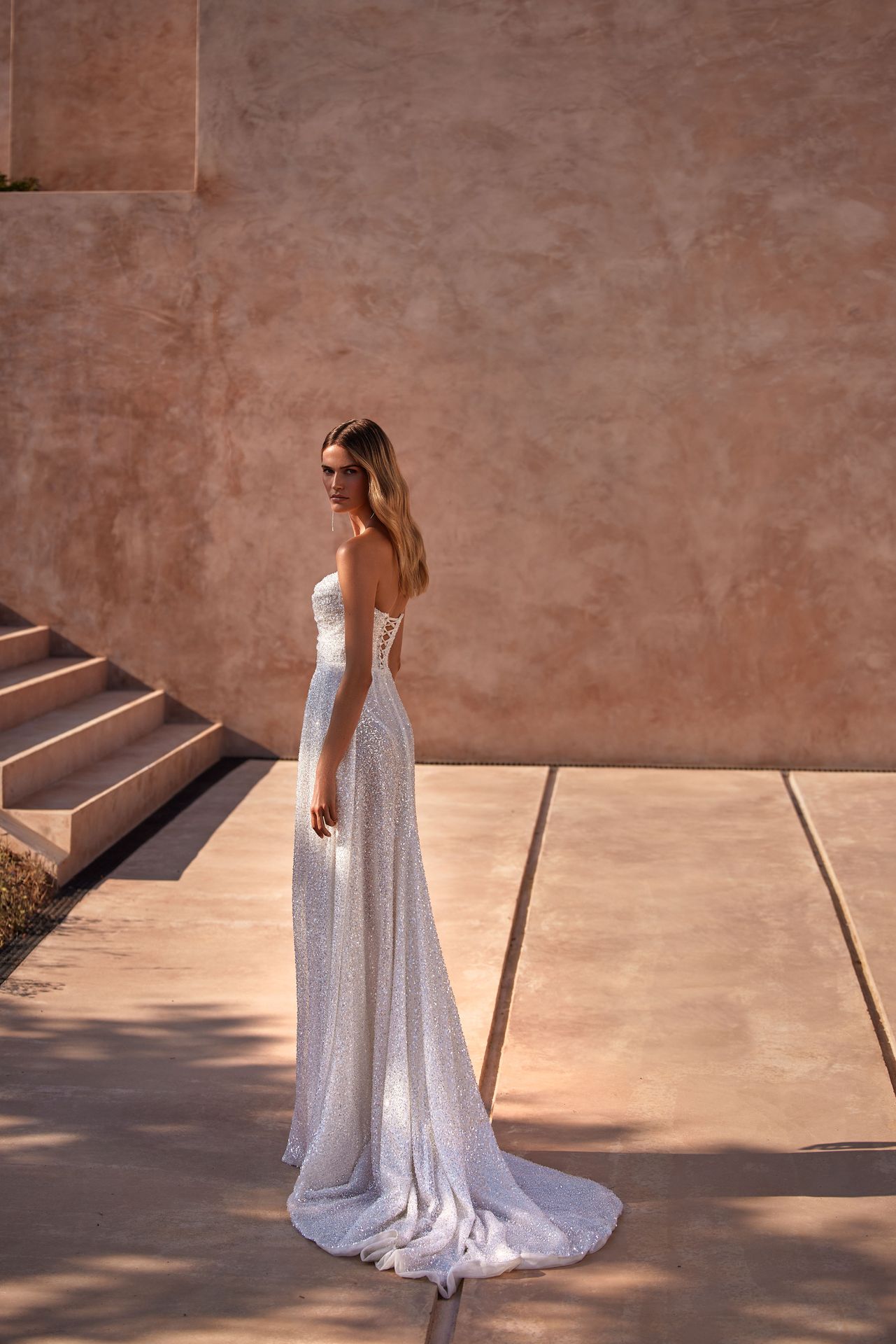 Spektakularna suknia o kroju syrenki wykonana z koronki w całości ozdobionej cekinami. Z prostym geometrycznym gorsetem, sznurowanym zapięciem na plecach i maxi spódnicą kunsztownie plisowaną w talii. W zestawie komplet bielizny.