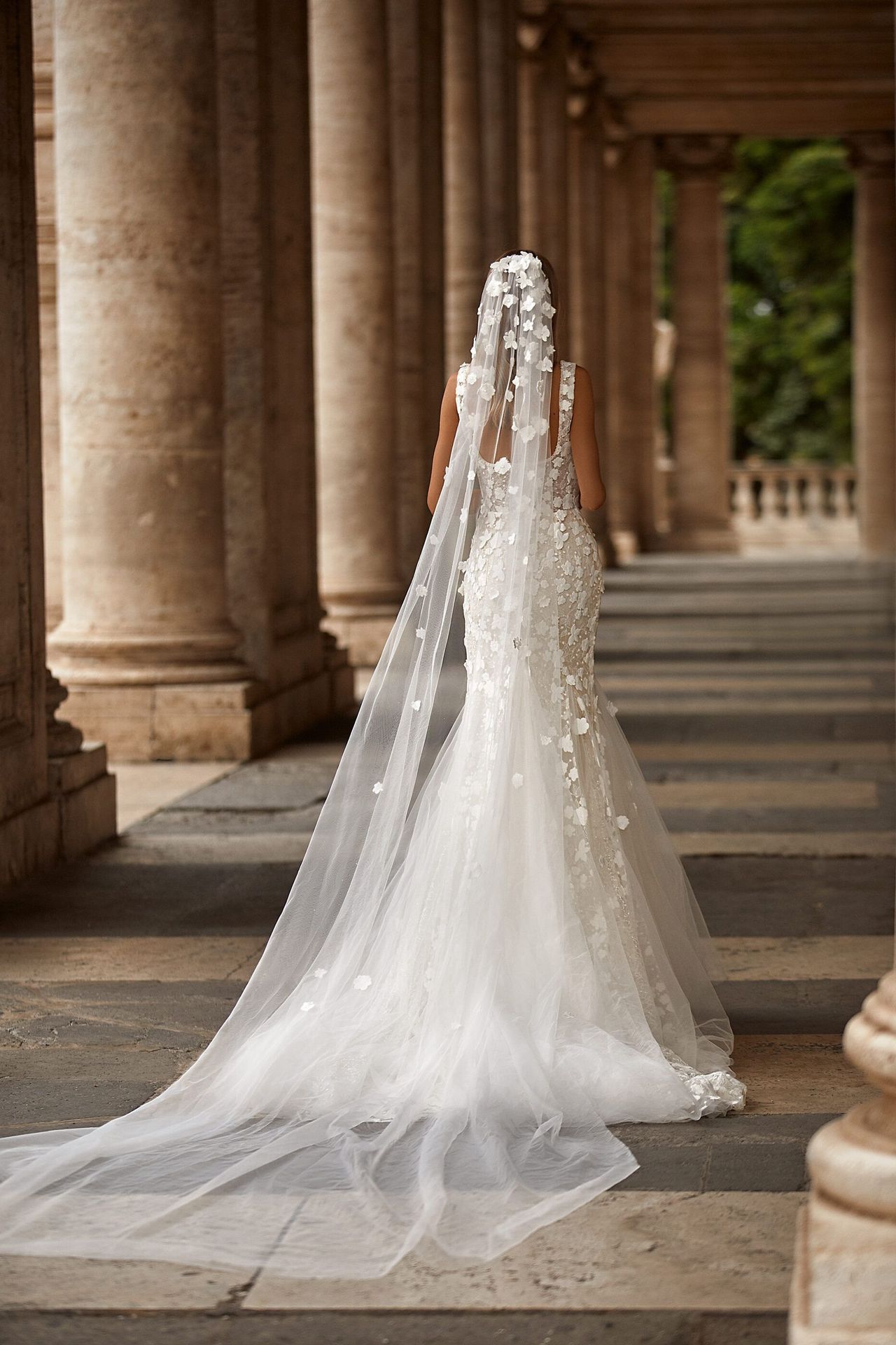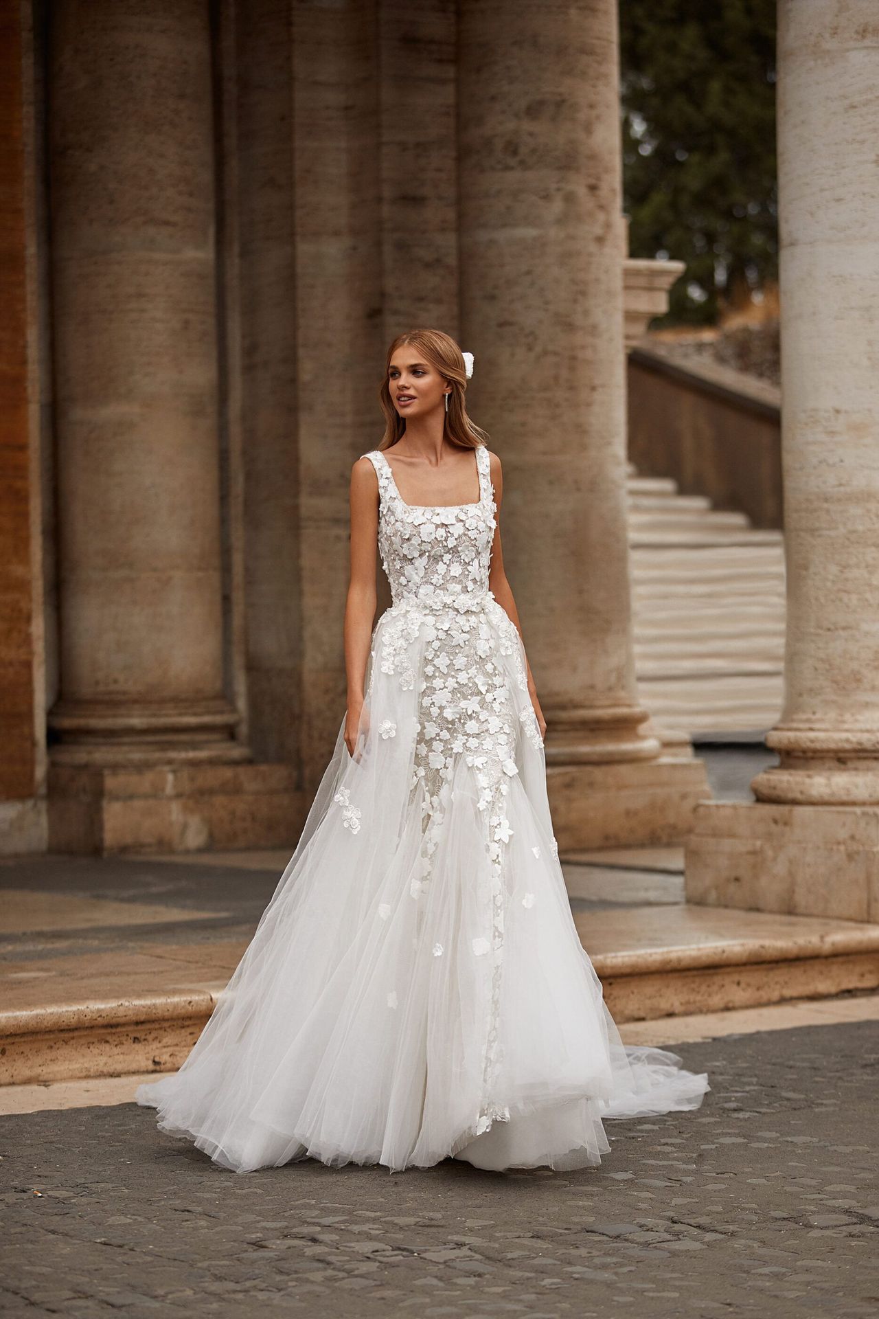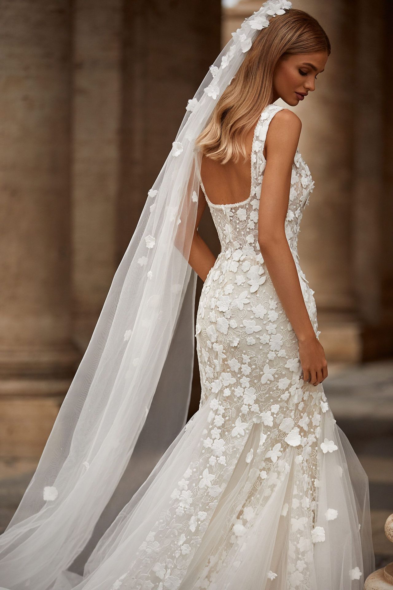 Marzycielska suknia ślubna o sylwetce syrenki w kolorze kości słoniowej z kwadratowym dekoltem. Suknia jest w całości pokryta haftem 3D w kwiaty. Dodatkowy tren Massima sprawi, że spódnica będzie bardziej puszysta.