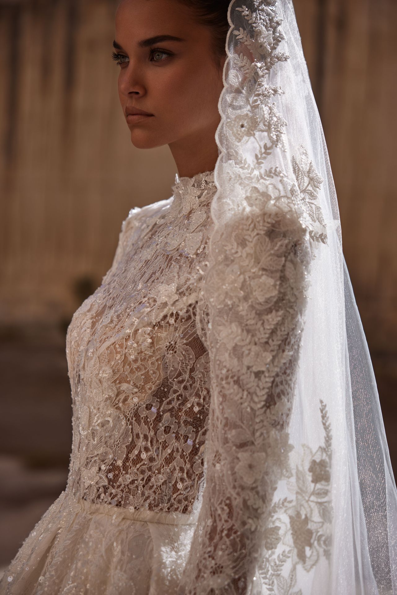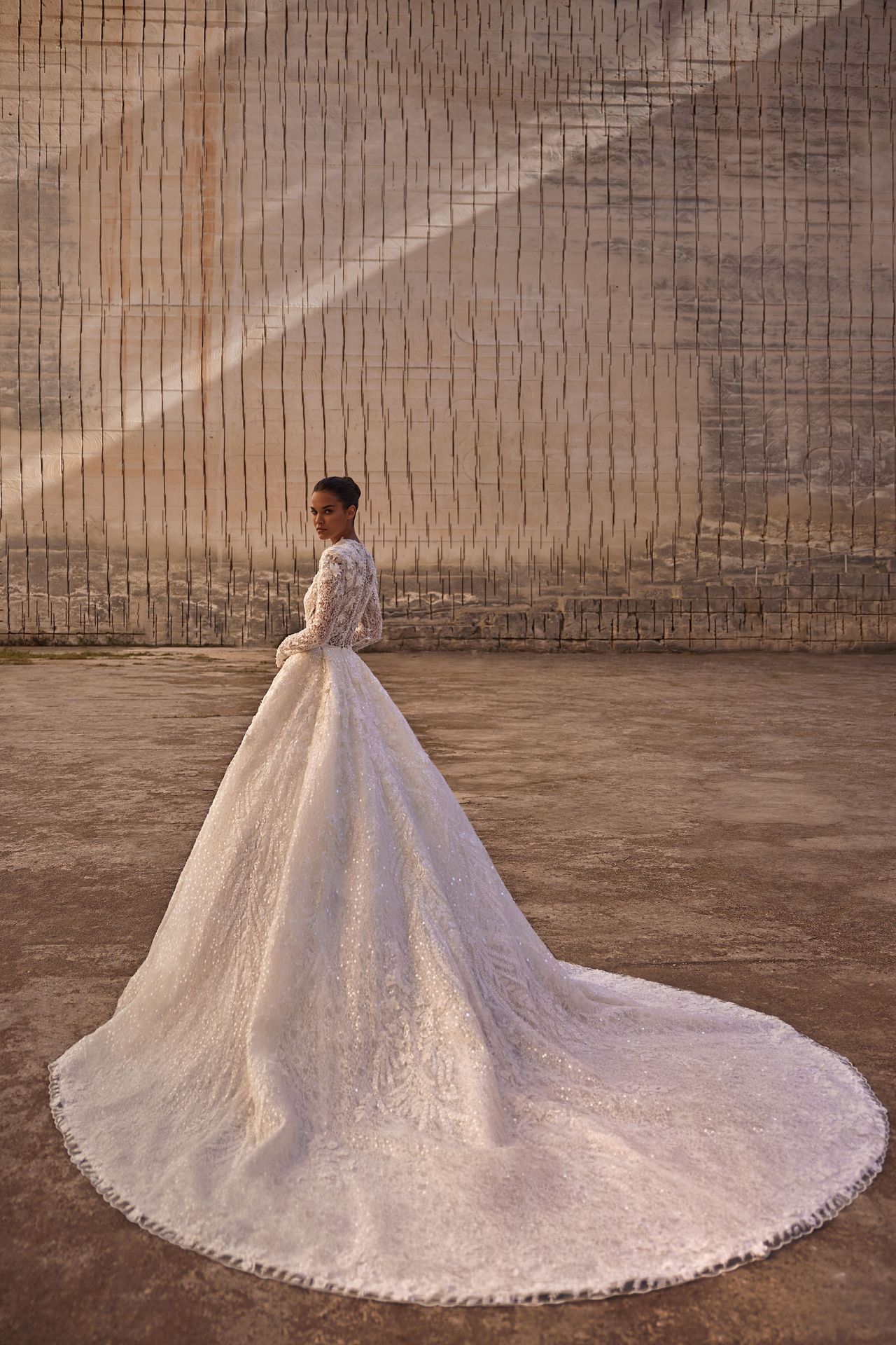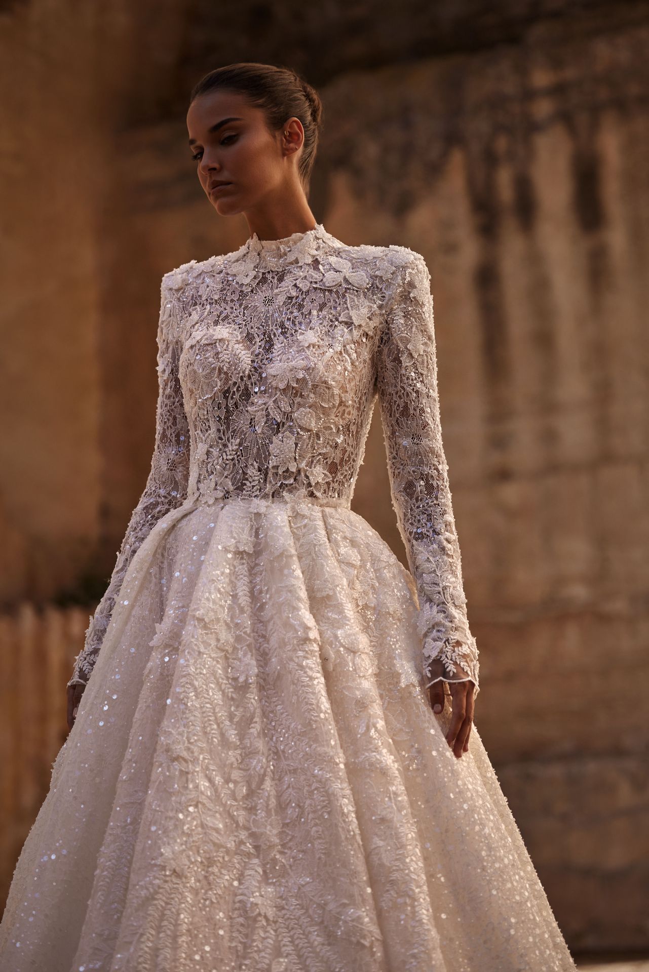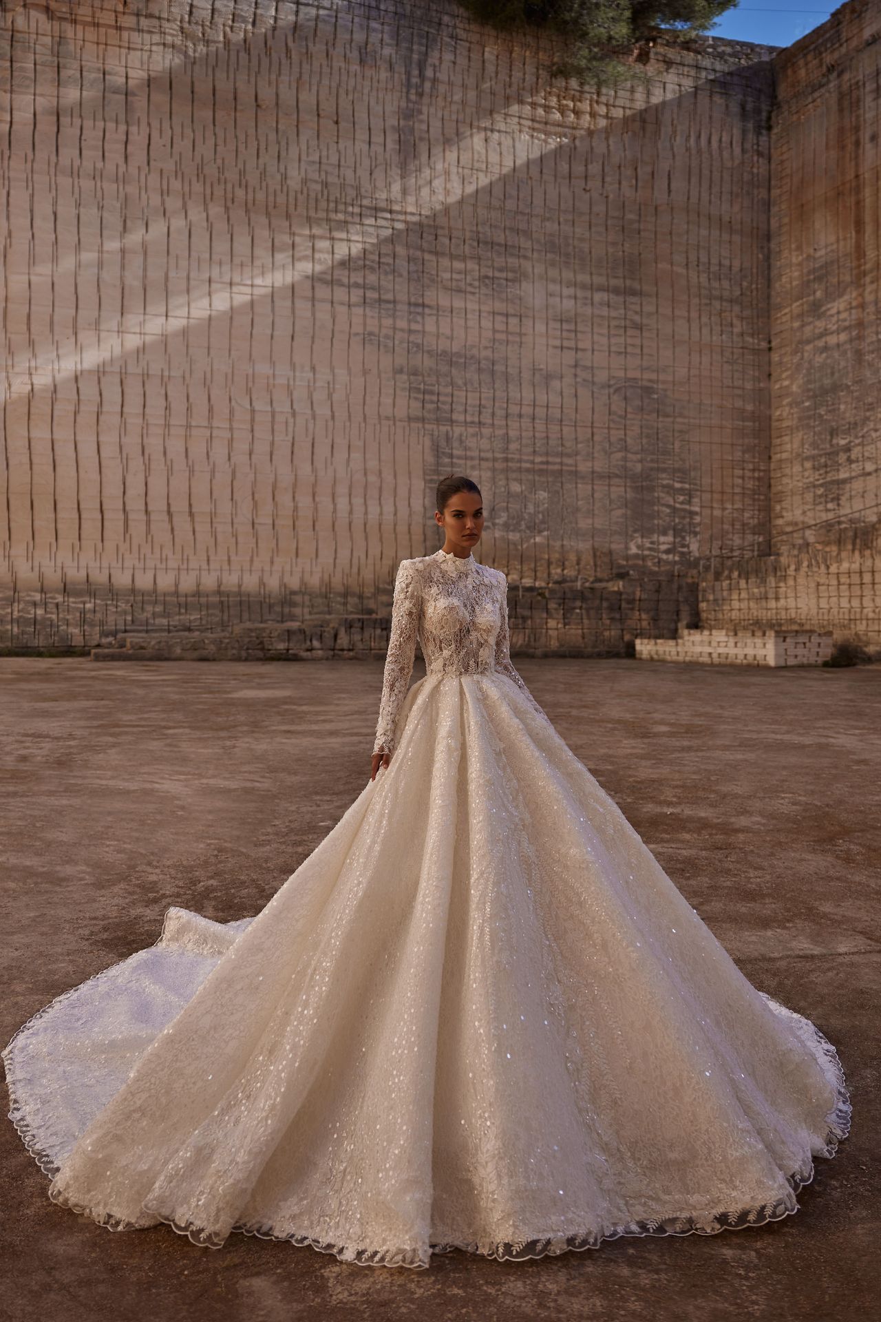 Suknia balowa z długimi rękawami wykonana z ozdobnej koronki. Posiada gorset z golfem, podwójny gorset z wszytym dodatkowym gorsetem modelującym, zdobione koronkowe długie rękawy z kwadratowymi ramionami, haftowany dżetami, kwiatami 3D i cekinami gorset oraz obszerną spódnicę księżniczki z długim trenem. Aby uzyskać najlepszy wygląd, dodaj welon Monroe.