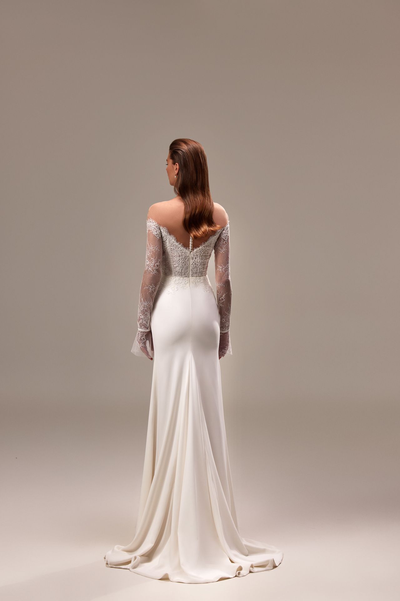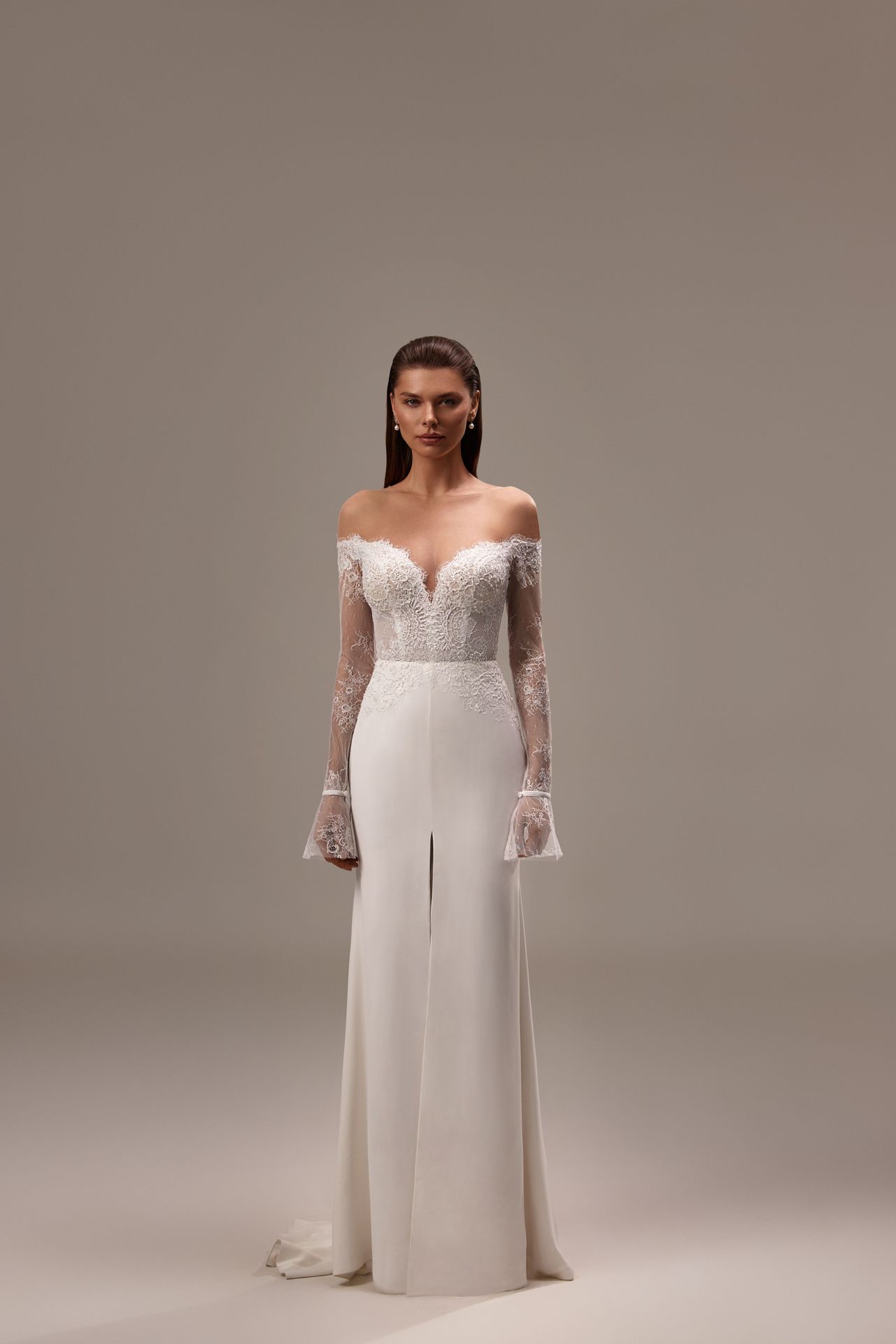 Bohemska suknia ślubna z długimi rękawami na ramiączkach wykonana z szyfonu z koronkowym ornamentem chantilly na gorsecie. Z dekoltem w kształcie serca, długimi rękawami z odkrytymi ramionami, półprzezroczystym gorsetem, zapinanym na guziki tyłem i dopasowaną spódnicą z wysokim rozcięciem z przodu i trenem midi.