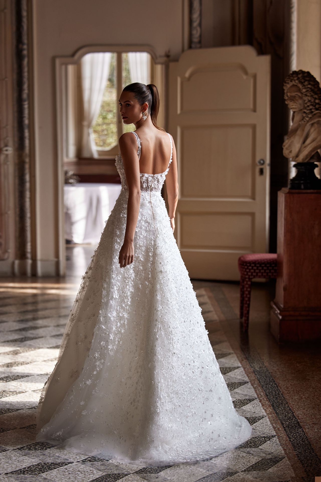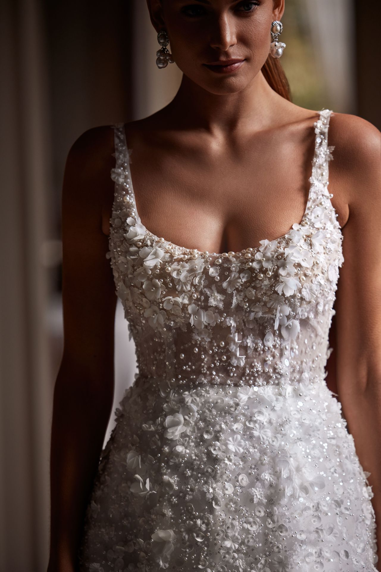 Marzycielska, półprzezroczysta suknia ślubna w całości pokryta cekinami i kwiatowymi aplikacjami 3D. Z kwadratowym gorsetem na ramiączkach i zdobioną spódnicą maxi z delikatnym trenem.