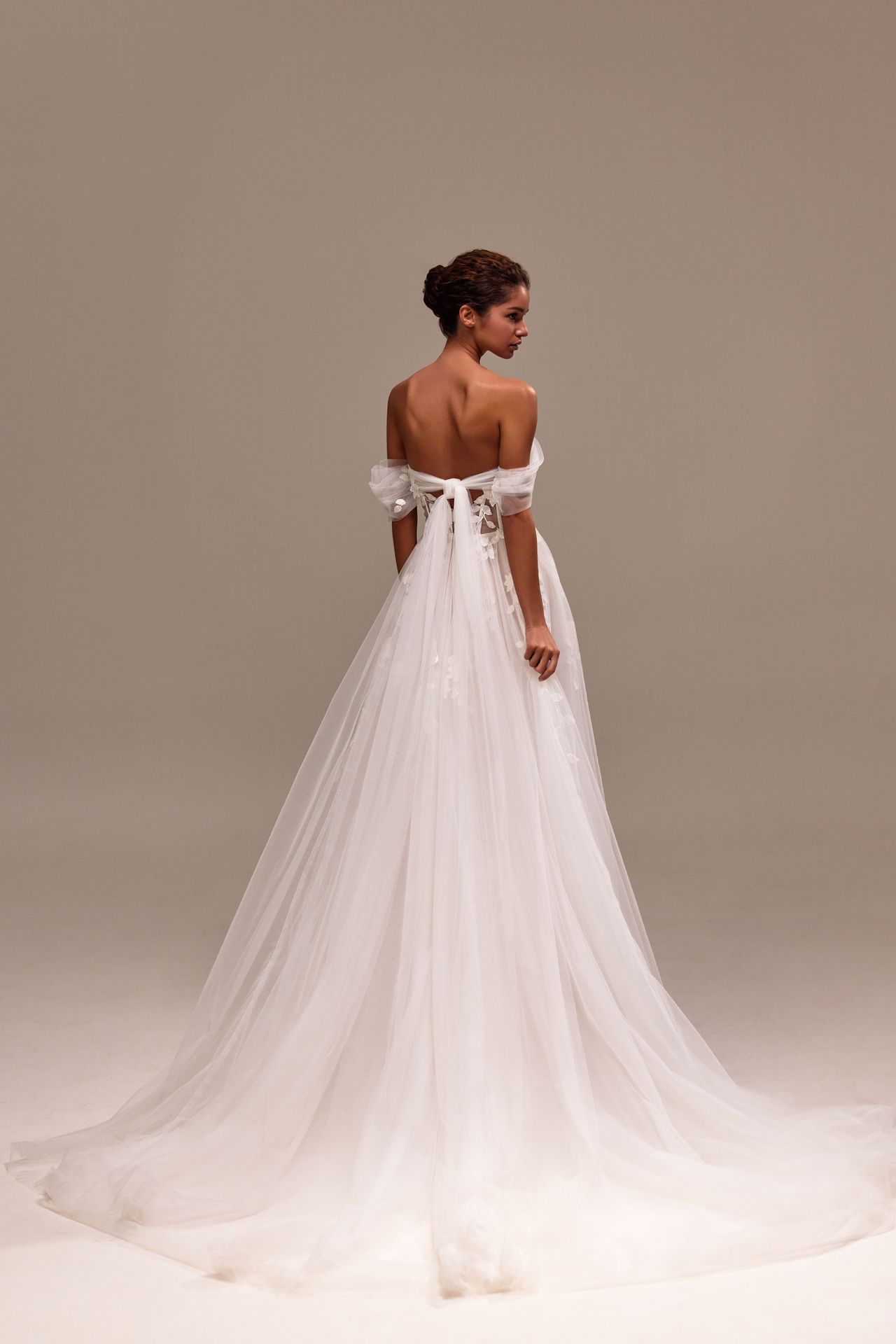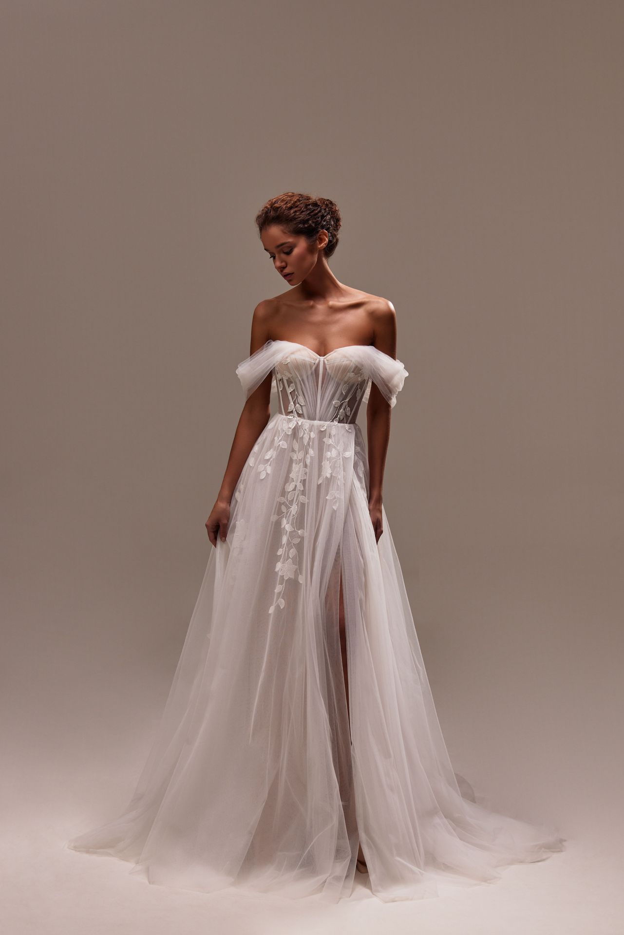 Hipnotyzująca tiulowa suknia ślubna z odkrytymi ramionami, wirtuozersko ozdobiona ręcznie wykonanymi wolumetrycznymi kwiatowymi aplikacjami. Posiada tiulową spódnicę maxi z długim trenem, gorset w kształcie serca z tiulowymi rękawami z odkrytymi ramionami, które można zawiązać na kokardę z tyłu, oraz sznurowane zapięcie z tiulu.
