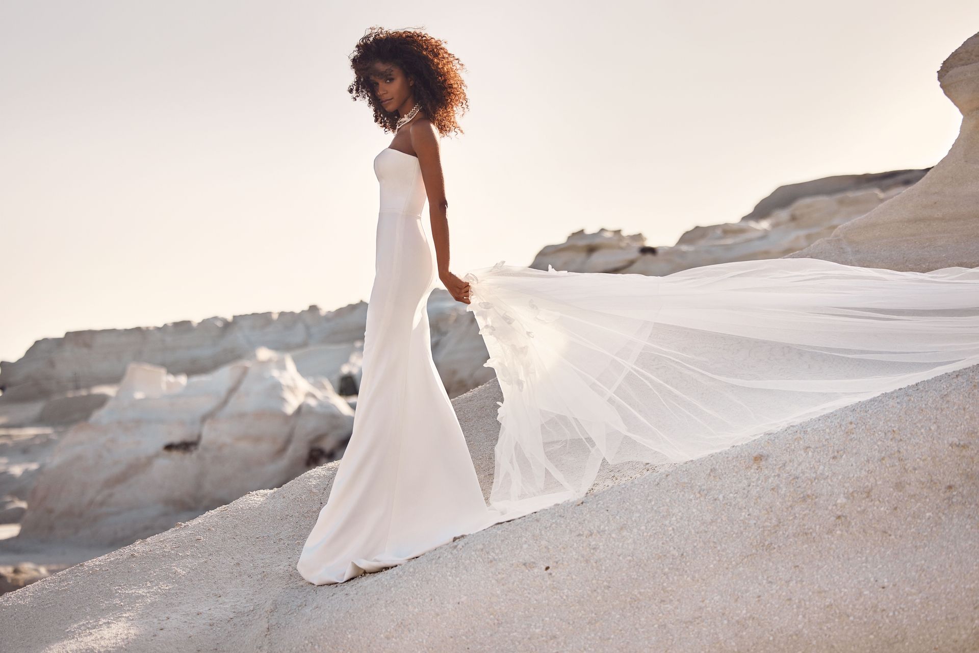 Szykowna suknia ślubna o kroju syrenki z gabardyny z prostym dekoltem w kształcie litery V bez ramiączek. Może być uzupełniona dodatkami ozdobionymi delikatnymi ręcznie wykonanymi szyfonowymi płatkami kwiatów 3D: marzycielskie przezroczyste bolerko, bardzo długie przezroczyste rękawiczki lub dwupoziomowy welon.