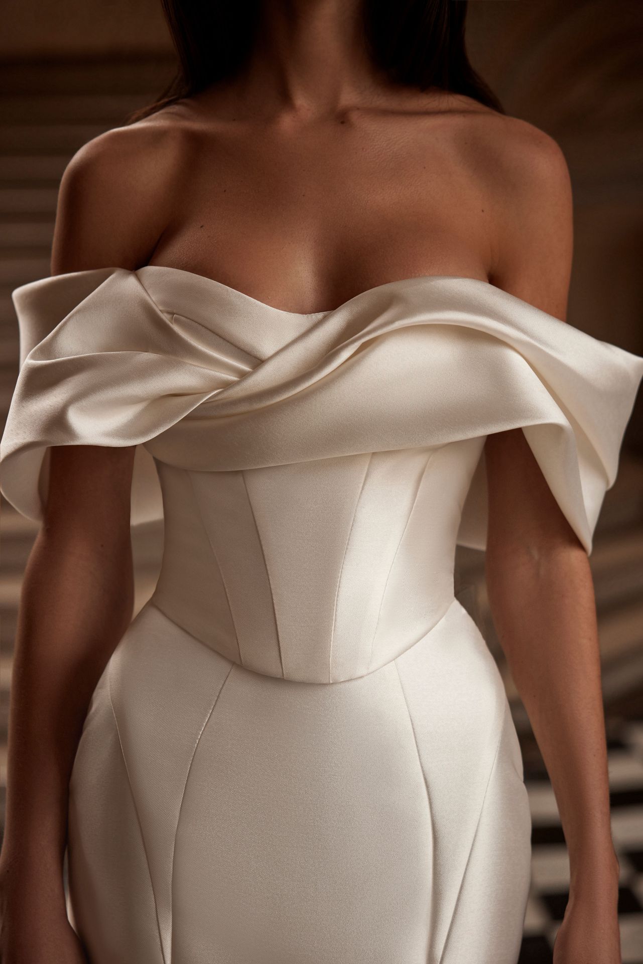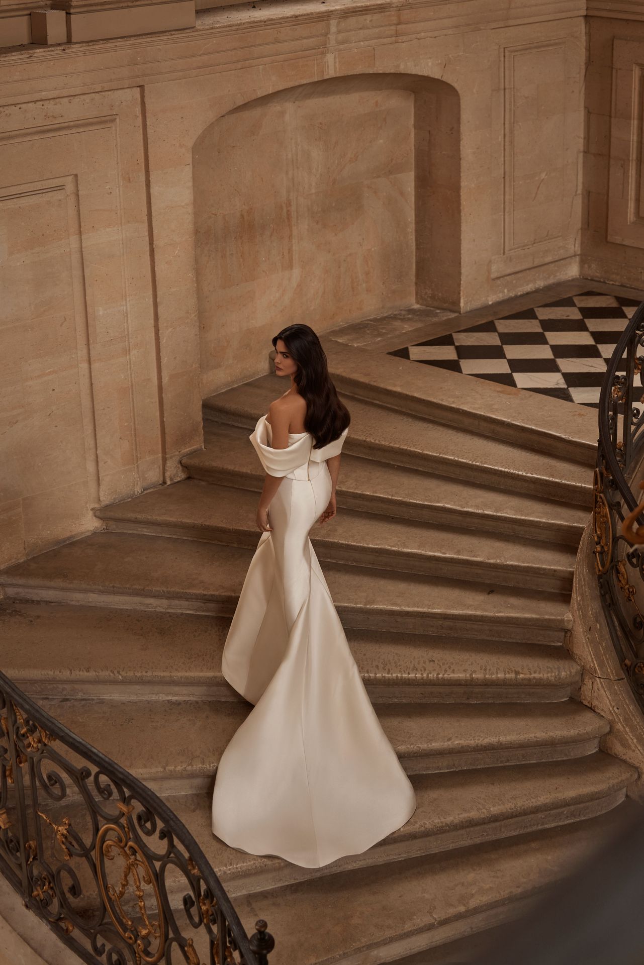 Suknia o kroju syrenki Lux Mikado z drapowanym dekoltem w kształcie serca z kokardą, rękawami odkrywającymi ramiona, gorsetem z zamkiem błyskawicznym na plecach i dopasowaną spódnicą maxi z krótkim trenem. Może być uzupełniona odpinanym trenem mikado, który kołysze się w urzekającej harmonii z każdym ruchem.