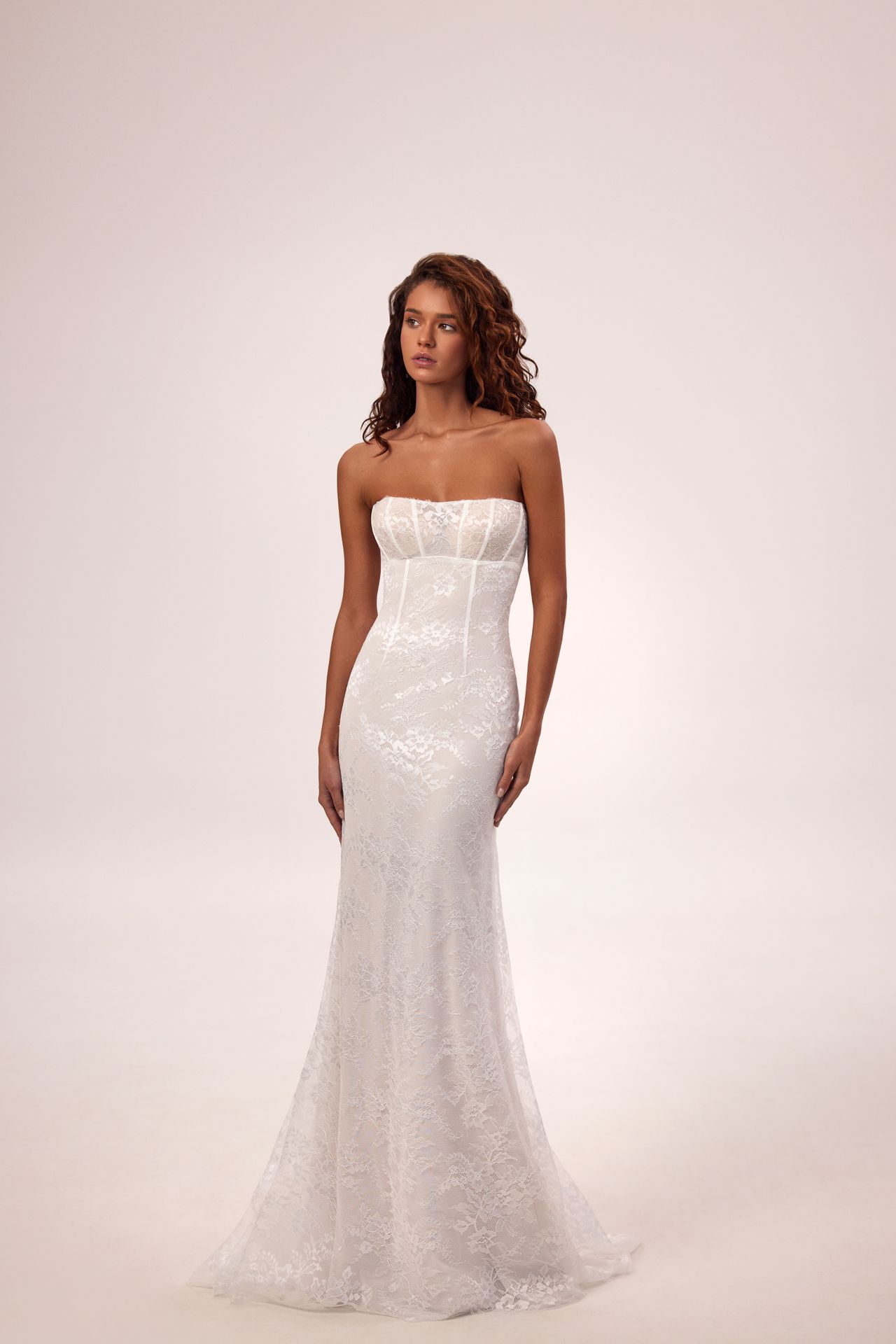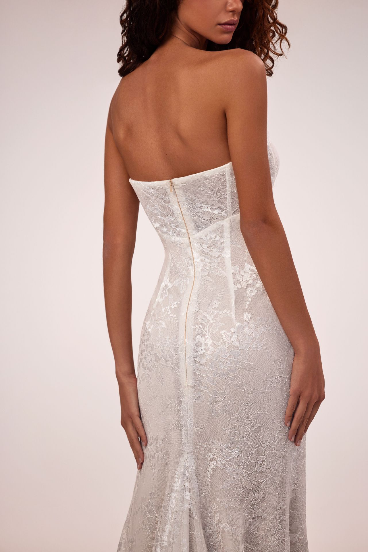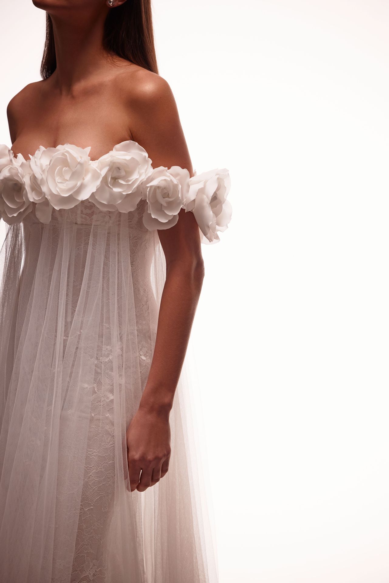 Dopasowana suknia ślubna z koronki chantilly z zwiewną tiulową nakładką ozdobioną wolumetrycznymi różami. Tiulowa nakładka nadaje całości modnego wyglądu.