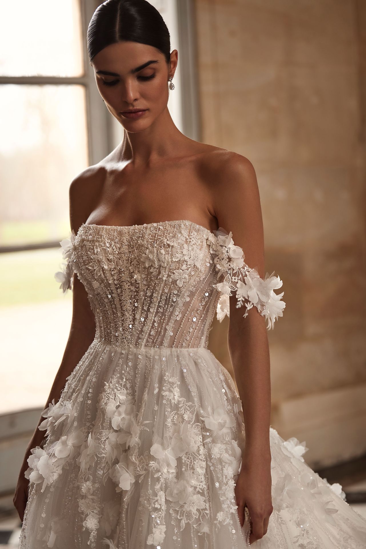 Bujna suknia ślubna o linii A z odkrytymi ramionami, wycięta z nieważkiego tiulu z ręcznie wykonanymi aplikacjami kwiatowymi 3D i cekinami, które rozciągają się wokół dopasowanego prostego gorsetu i górnej części bufiastej spódnicy maxi.