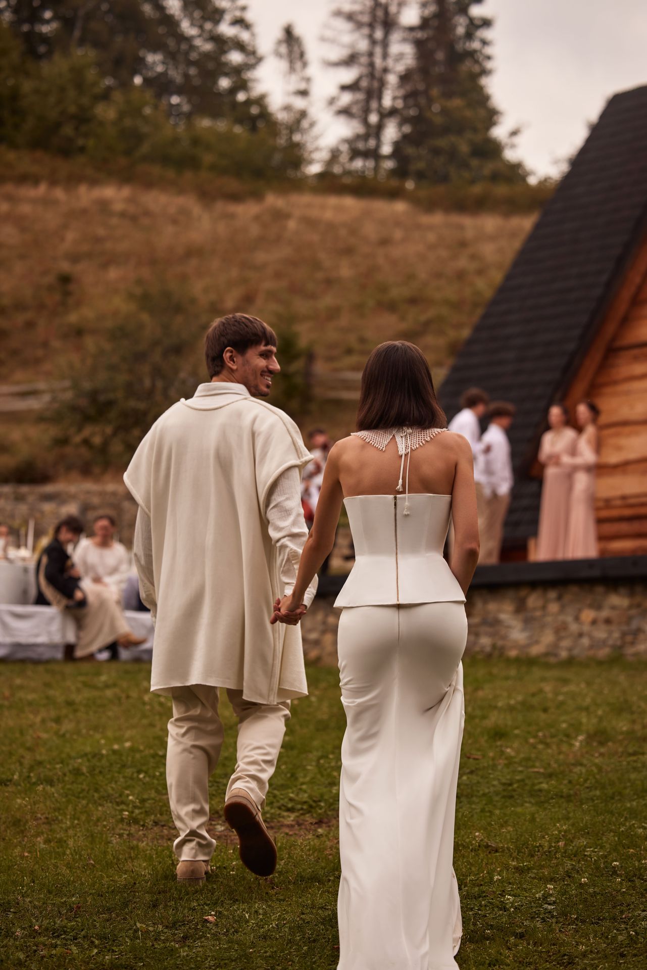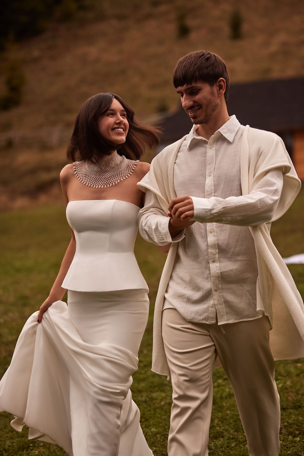Dwuczęściowa suknia ślubna w starym stylu z klasycznym gorsetowym topem z prostym dekoltem, wcięciem w talii i zamkiem błyskawicznym z tyłu, w połączeniu ze spódnicą w kształcie syrenki, która elegancko ciągnie się za krótkim trenem. Akcesoria do tego modelu można kupić online.
