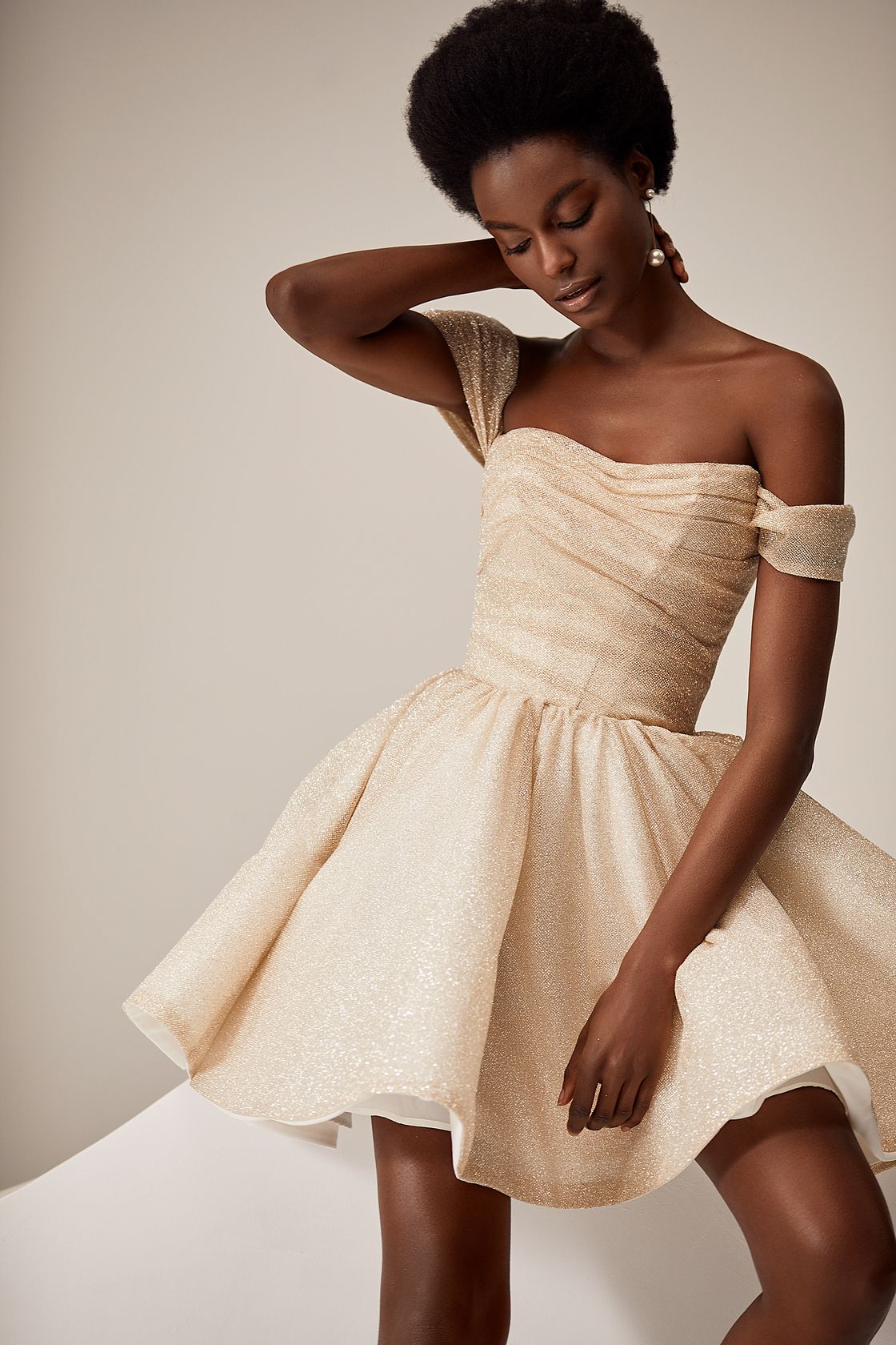 Złoto-srebrna mini suknia ślubna z brokatu z dekoltem odsłaniającym ramiona i bufiastą spódnicą księżniczki. Idealna jako druga suknia ślubna lub suknia wieczorowa.