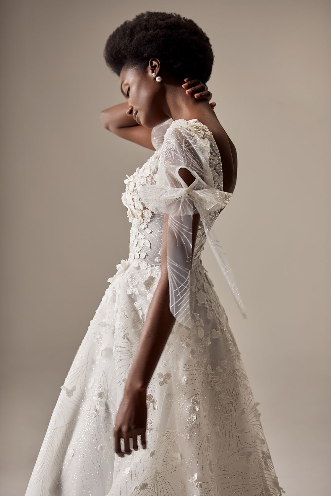 Tiulowa suknia ślubna o linii A z głębokim dekoltem V, ozdobiona kwiatami 3D, krótkimi rękawami i długim trenem. Dostępna bez kokardek na rękawach.