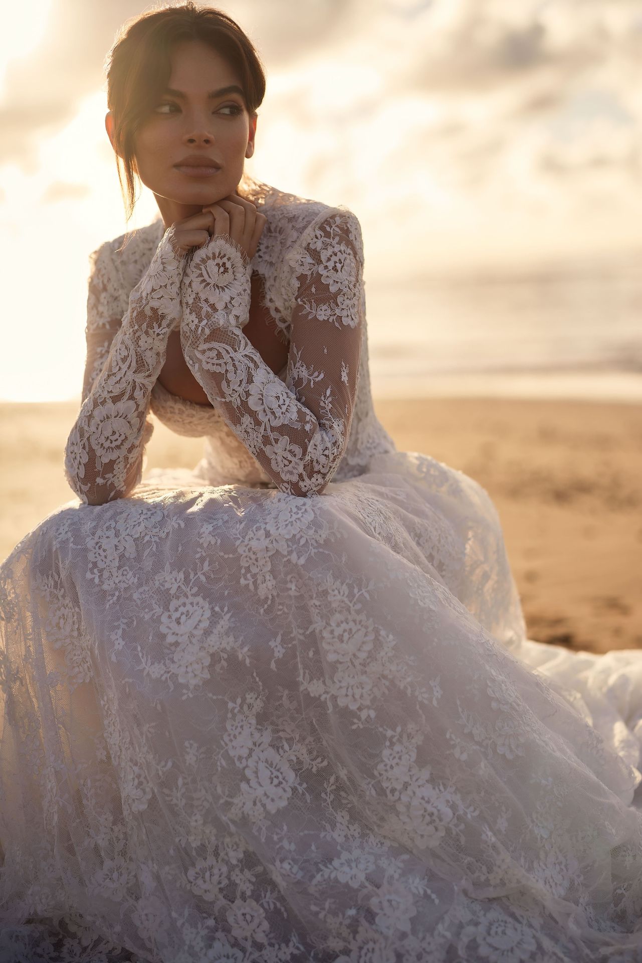 Elegancka suknia ślubna księżniczki wykonana z luksusowego mikado. Stylizacja obejmuje gorset z odpinanymi, delikatnie drapowanymi rękawami z odkrytymi ramionami, wiązanie w talii, suwak błyskawiczny lub koronkowe zapięcie na plecach oraz asymetrycznie drapowaną spódnicę. Zwieńczeniem sukni jest drapowana, pełna spódnica maxi z obszernym trenem maxi. Połącz z tiulowym welonem Valora o długości katedry, aby uzyskać dodatkową nutę wyrafinowania.