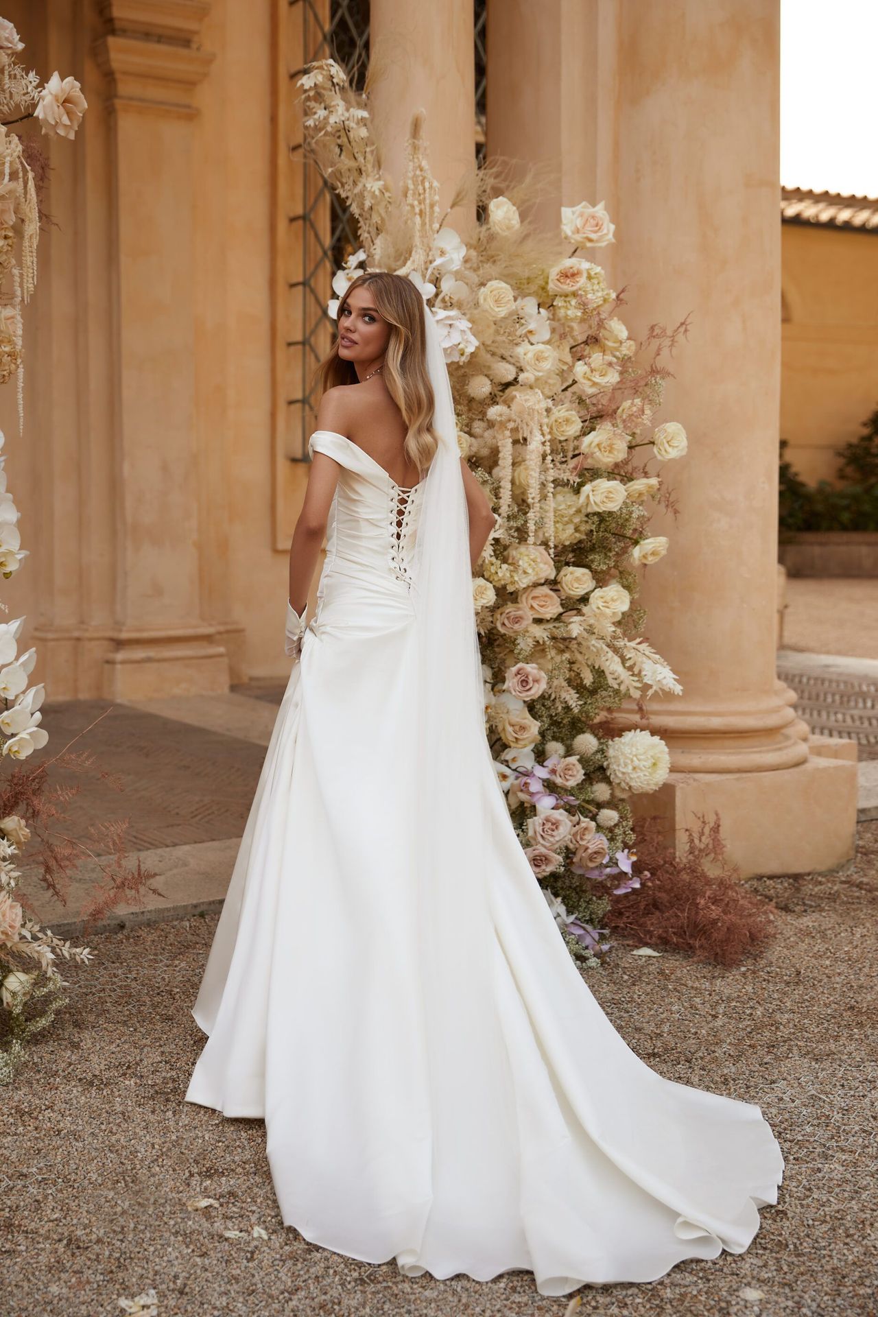 Satynowa suknia o linii A z drapowaniami w kolorze kości słoniowej z gorsetem z odkrytymi ramionami, sznurowanym zapięciem i trenem midi.
