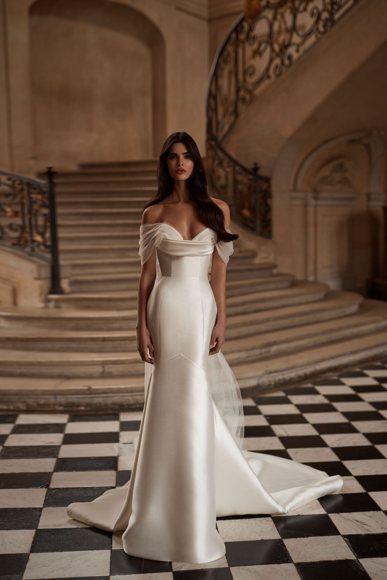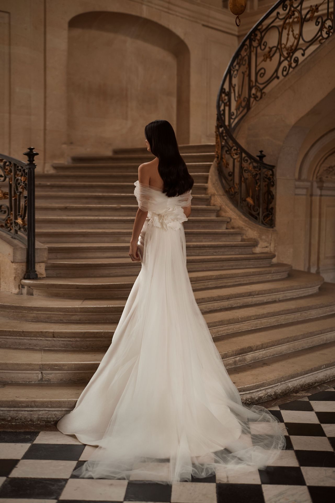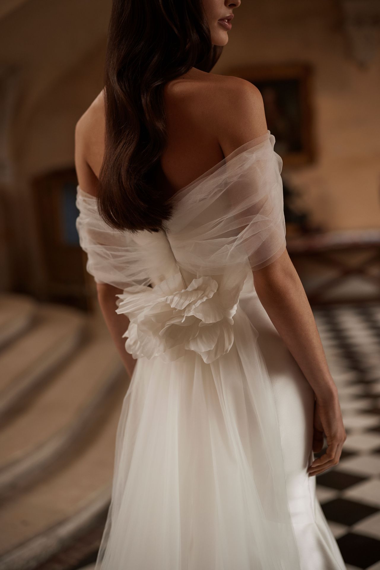 Elegancka suknia ślubna o kroju syrenki, wykonana z mikado, o dopasowanej sylwetce i długości do podłogi. Posiada dekolt w kształcie serca otoczony tiulowymi ramiączkami poza ramiona i dopasowaną sylwetkę bodycon z krótkim trenem. Może być uzupełniona pasującym tiulowym trenem z kwiatem 3D na plecach.