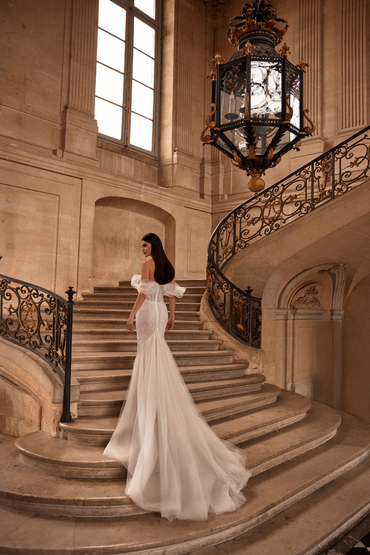 Niezwykła, półprzezroczysta, w pełni ręcznie zdobiona koronkowa suknia ślubna z odpinanymi tiulowymi rękawami na ramiączkach. Wyposażona w usztywniany gorset z wbudowanymi miseczkami w kształcie serca i dopasowaną, zdobioną spódnicę z bufiastym, odpinanym tiulowym trenem pasującym do rękawów. Suknia jest misternie haftowana z wykwintnym cekinowym ornamentem.
