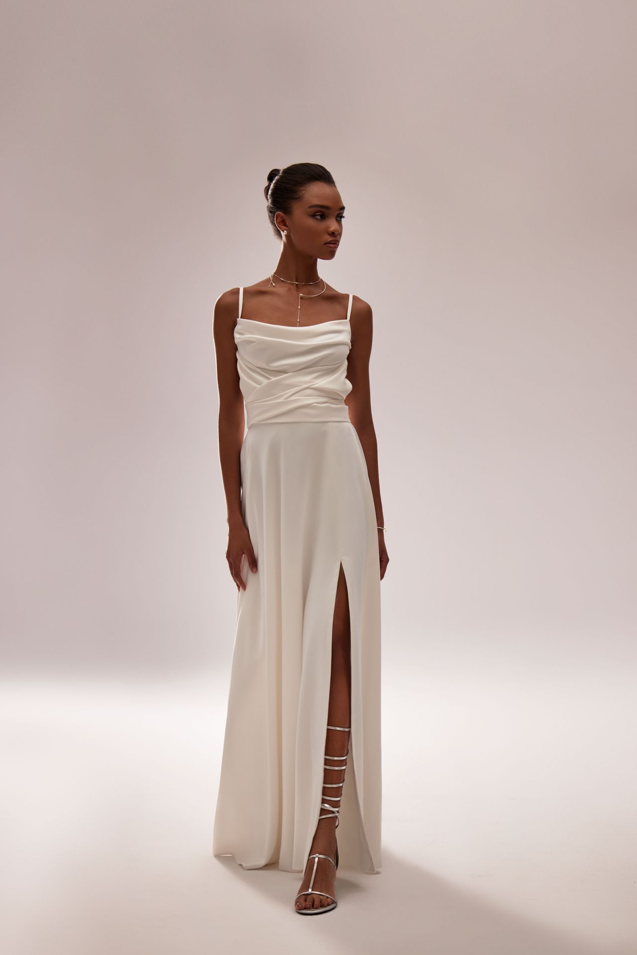 Elegancka satynowa suknia ślubna na ramiączkach w kolorze kości słoniowej. Prosta sylwetka o długości do podłogi z bocznym rozcięciem na spódnicy i głęboko odkrytymi plecami z węzłem.