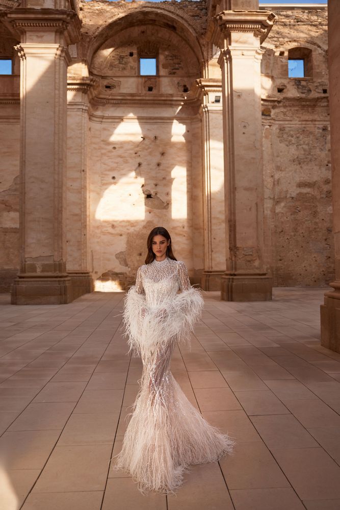 Showstopper bolero adorned by hand with ostrich feathers. Delicate feathers serve as an accent, forming a captivating focal point that elevates the beauty of the bride.