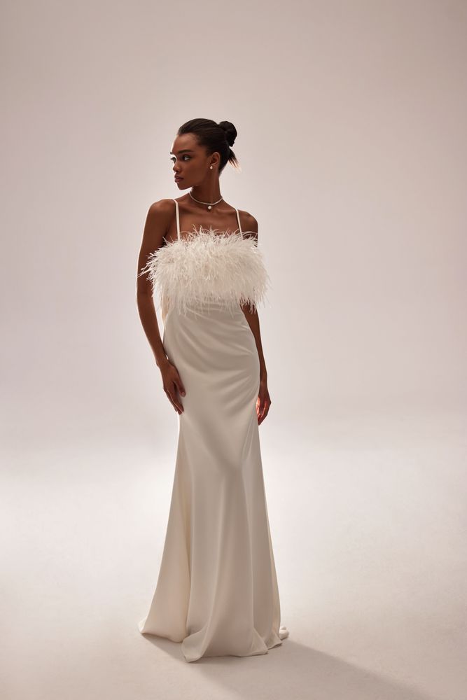 Jazzy sheath fitted wedding gown on spaghetti straps with feathers on the bodice, extremely deep open back, and a short train.